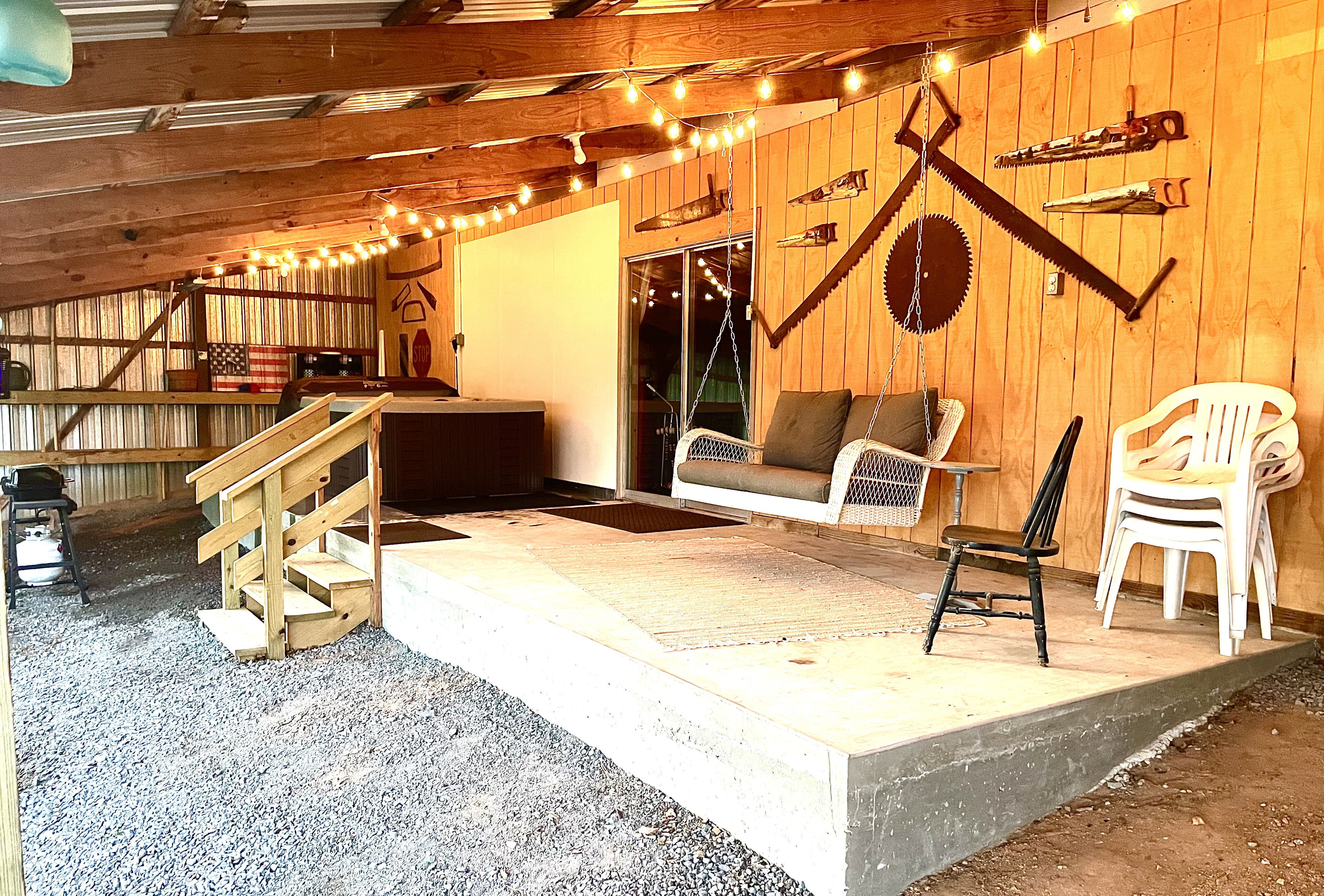 The living room opens to the spacious covered back porch with a table seating six and more room for additional folding tables. Enjoy grilling out on the 6-burner gas grill while watching the sunset and enjoying a cold beverage. Walk down the steps to the large firepit with plenty of seating while the family plays horseshoes. Once the sun goes down, turn on the string lights for additional lighting.