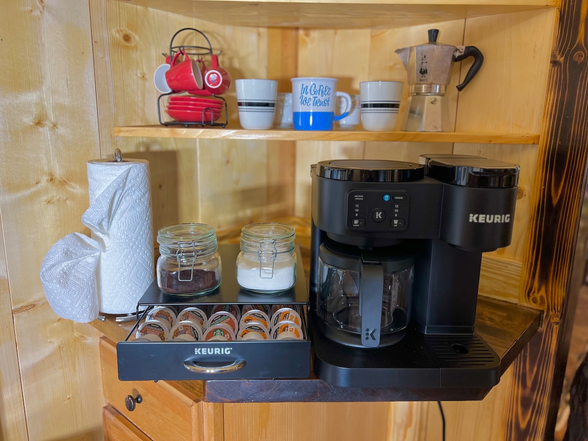 Kitchen amenities include a full-sized stove, microwave, refrigerator, and dishwasher. All necessary silverware, cookware, and drinkware are provided. To start the day out right, there is a Keurig machine ready to brew your coffee, hot tea, or hot chocolate!