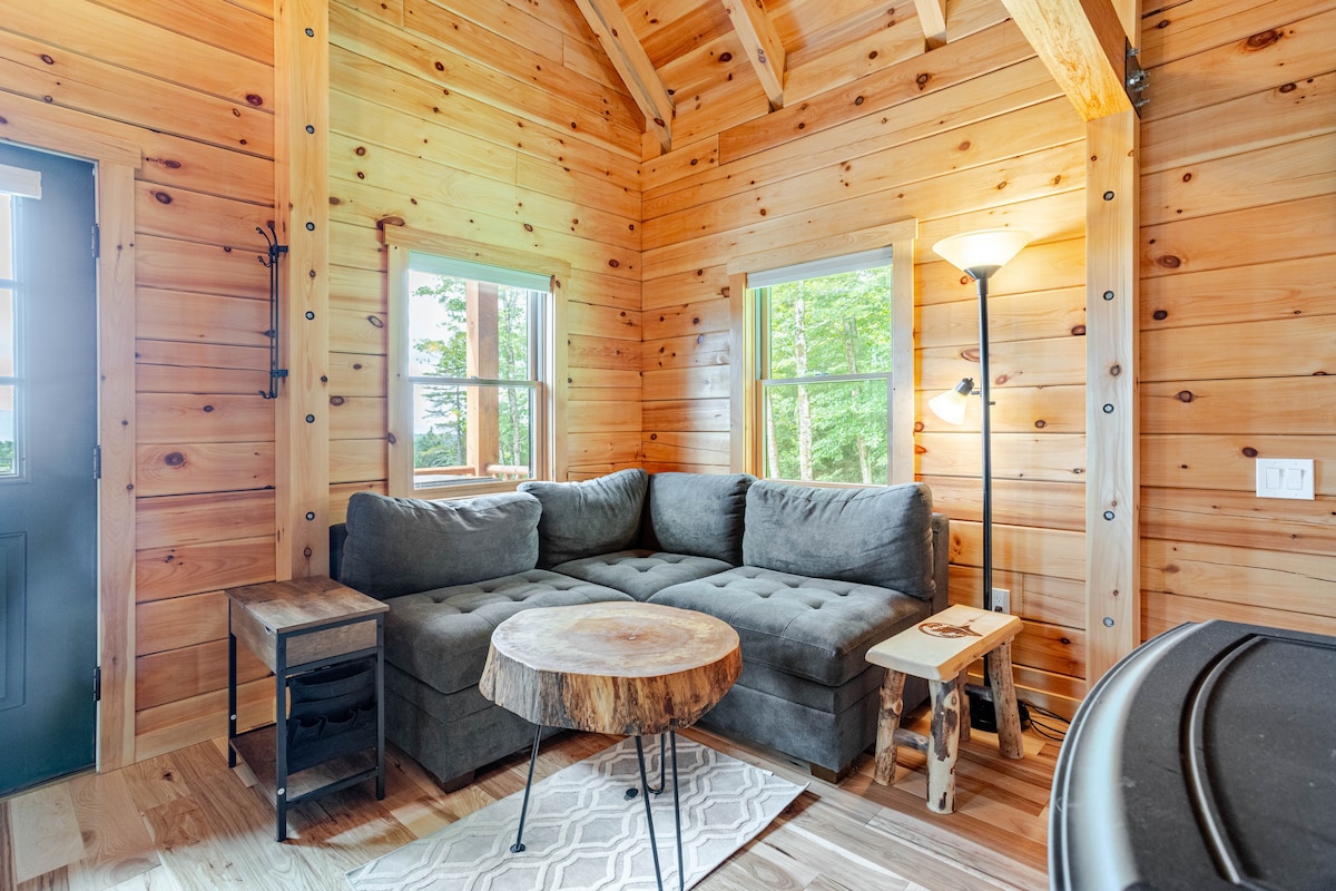 Upon entering the cabin, you’re greeted by a stylish open-plan kitchen and living area, where warm wood paneling and expansive windows frame peaceful forest views. The kitchen is thoughtfully equipped with high-end appliances, a custom backsplash, and a deep purple farmhouse sink that adds a bold, artistic touch. Just off the kitchen, a charming dining table for four and a cozy daybed create the perfect spots to enjoy a meal or relax while soaking in the tranquil surroundings.