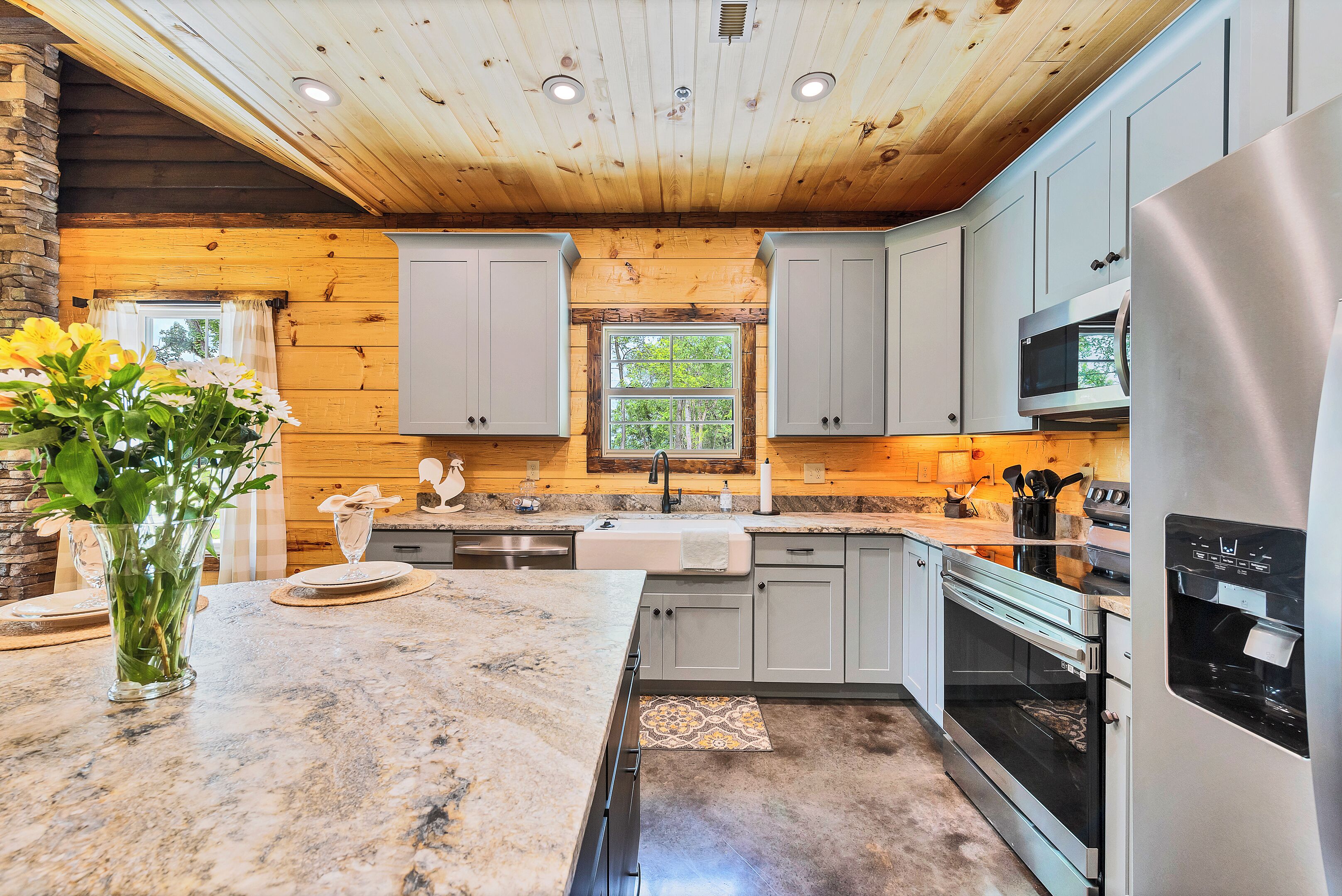 Step into the rustic charm of the cozy living room and be enveloped in warmth and comfort. This area is anchored by a stunning gas fireplace, perfect for chilly mountain evenings spent snuggled up with a good book or enjoying quality time with loved ones. A massive sectional sofa provides ample seating for lounging while two matching recliners beckon you to sink in and relax. And when you're ready to unwind, the large flat-screen TV is perfect for catching your favorite shows or movies. The room is filled with natural lighting during the day, streaming through the large windows framing the beautiful Smoky Mountain views. As the sun sets, the gas fireplace crackles to life, casting a warm glow over the entire space, making it the perfect spot to relax and unwind after a day of exploring the great outdoors.