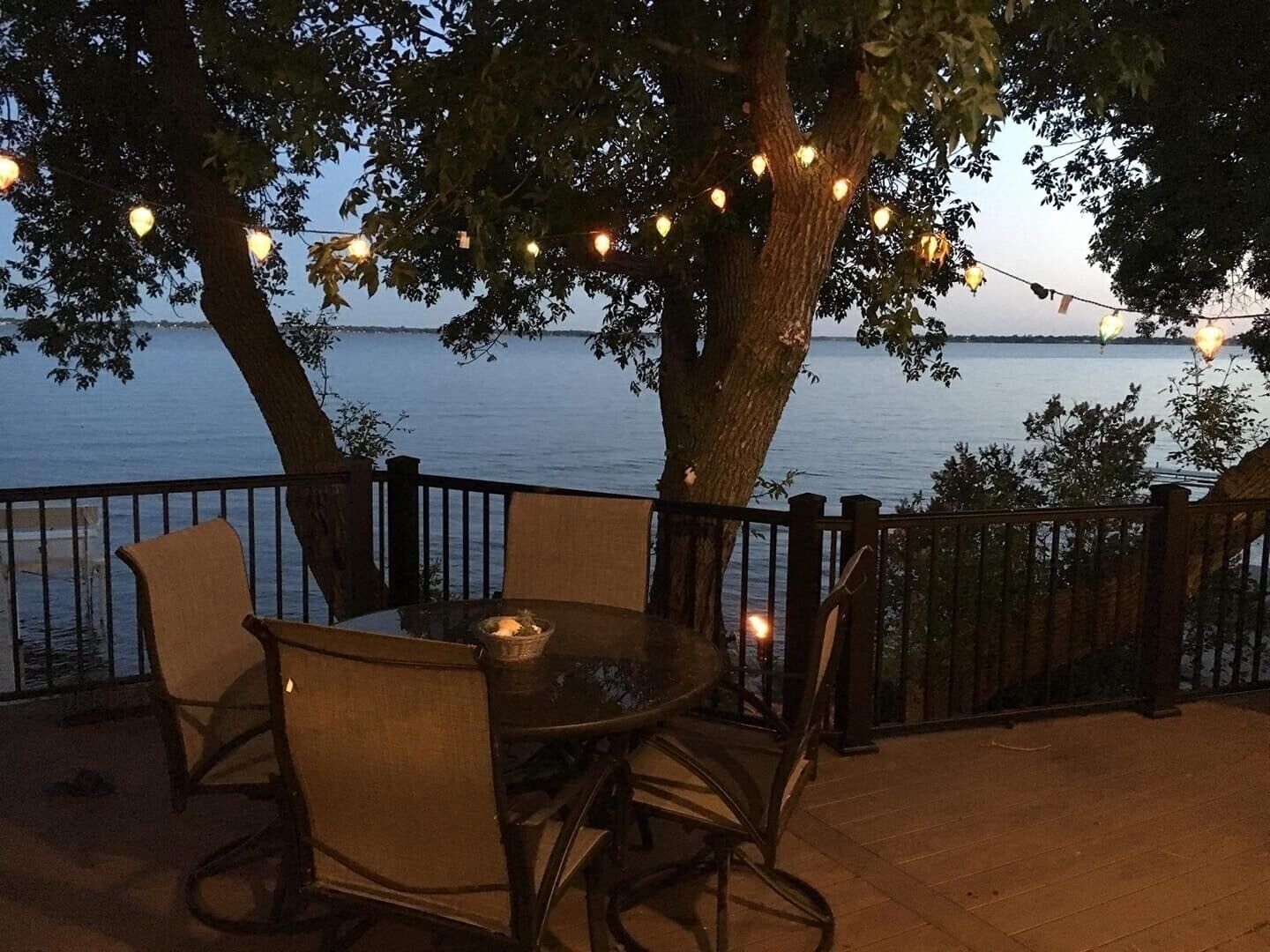 The outdoor concrete patio is perfect for late-night chats and roasting s'mores around the fire pit. This inviting space is where memories are made, and the beauty of the lake can be fully appreciated under the starry sky.