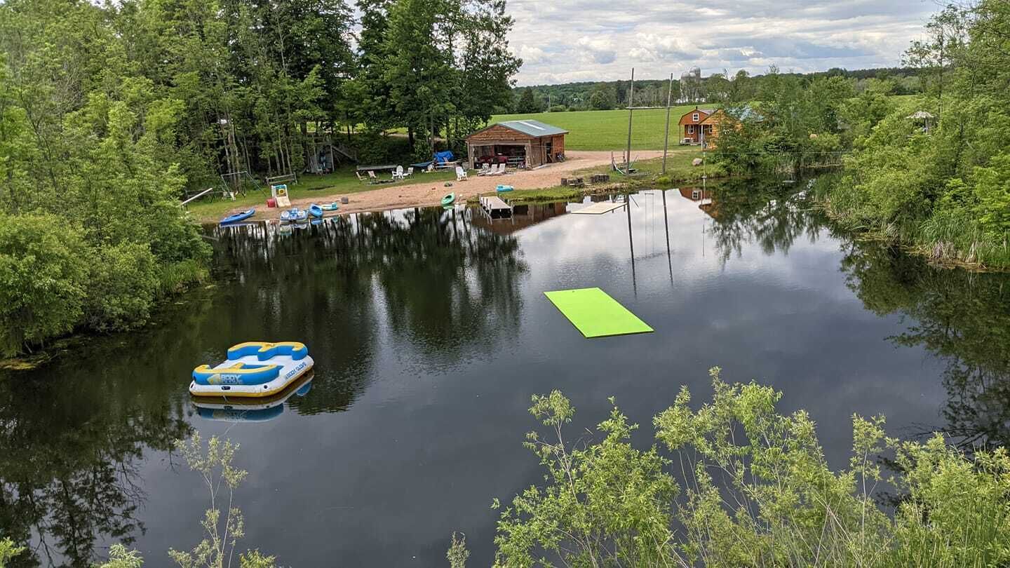 Man made pond about a 1/2 acres with fish and sandy beach for swimming. A swing and docks for going into the water. Paddle boad, kayaks and floating mats for swimming in the pond.