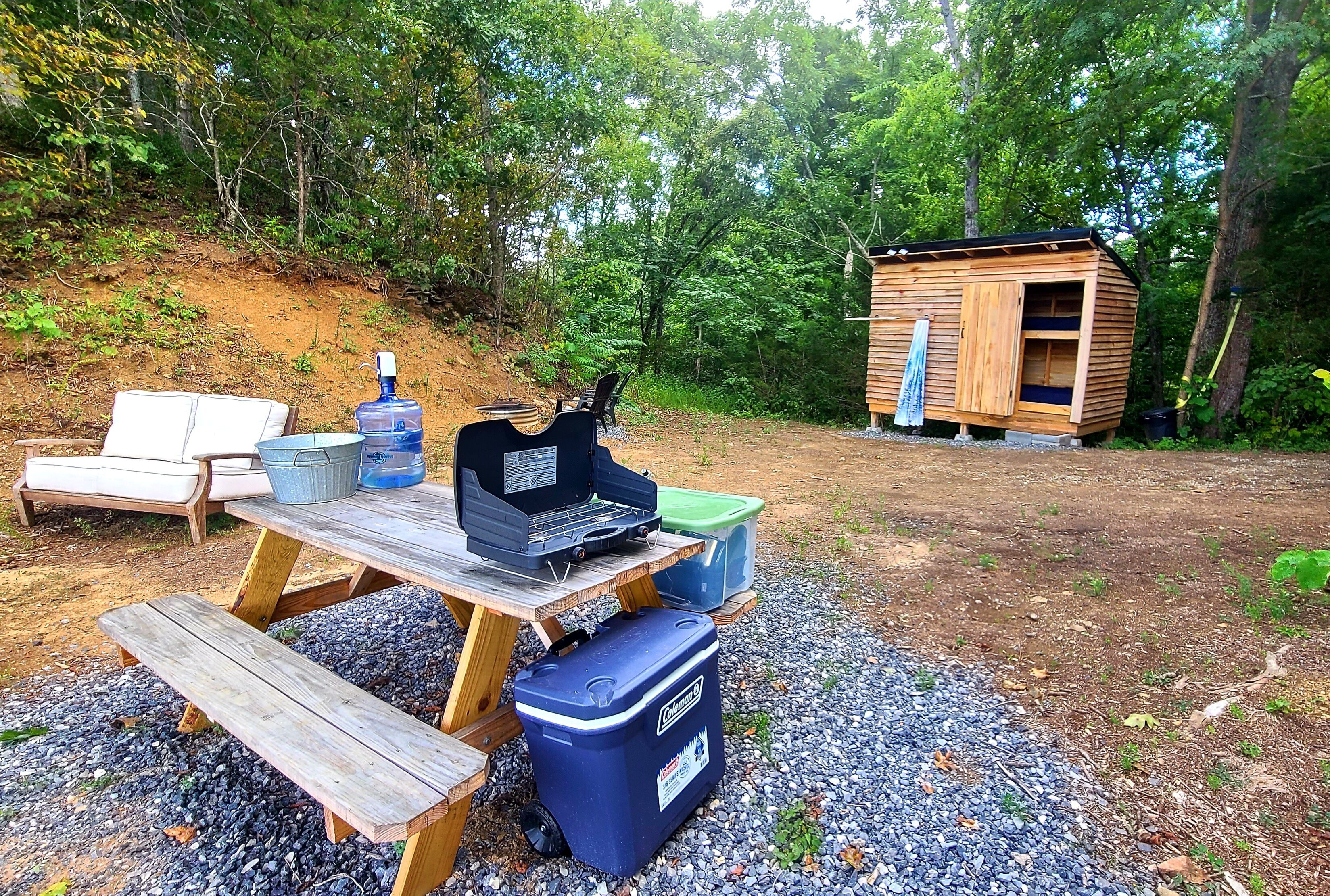 Outside you will find a firepit with Adirondack chairs, a picnic table and a bench for taking in the view with your morning coffee. A 2 burner campstove and all dishes are provided also. And a cooler for storing your food. Just bring ice/food, everything else is provided.
