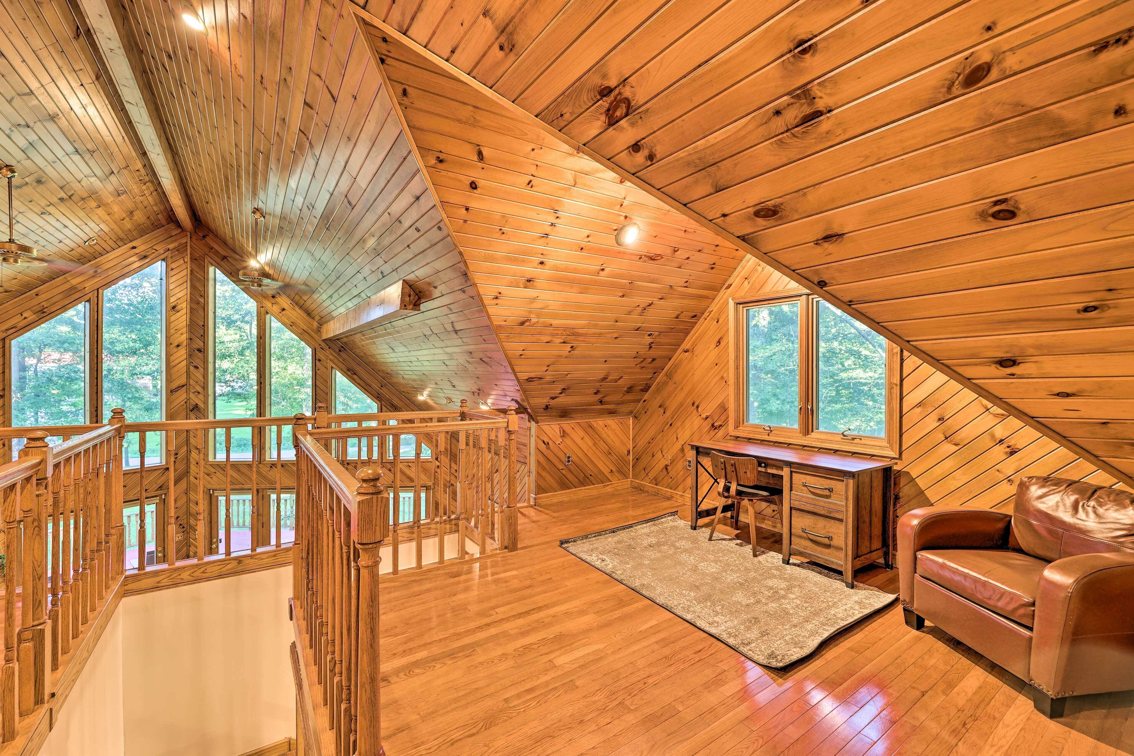 INDOOR LIVING: Spacious interior, cabin-themed decor, exposed wood, large windows, ceiling fans, computer, ping pong table, bar, telescope, dartboard, Smart TVs, video library, bathtubs, jetted tub, walk-in closets