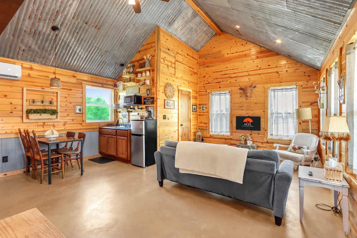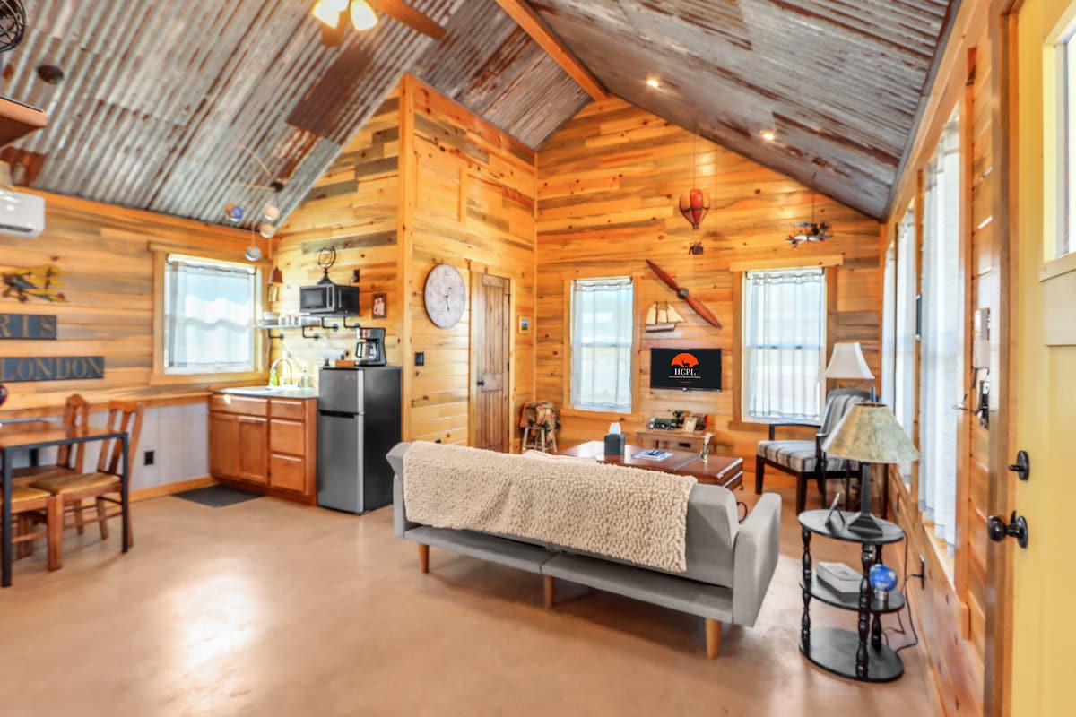 Step inside and you’ll be greeted by warm honey-toned wood walls, a corrugated metal ceiling, and whimsical pail light fixtures that set the tone for a relaxed and inviting stay. The living room is thoughtfully furnished with a comfortable flip-flop sofa that doubles as extra sleeping space for a fifth guest, a cozy club chair, and a wall-mounted streaming TV for your evening wind-down. Whether you’re coming back from wine tasting or hiking a nearby trail, this is your space to kick off your boots and settle in.