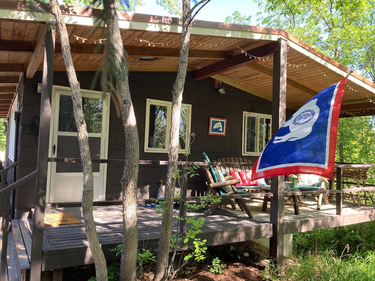 You'll love the location of this peaceful cabin only a 3 min drive from the river. After enjoying the best Trout fishing the country has to offer, relax on the deck or by the fire pit and enjoy a cold drink & great Mountain View's. This cabin is only 15 minutes N. of the famous Grey Reef Dam in Alcova Wy. It includes private access to fishing. We also have 3 other 2 bdrm units and a much bigger unit for up to 8 people with a pool table, dart board, and poker table.