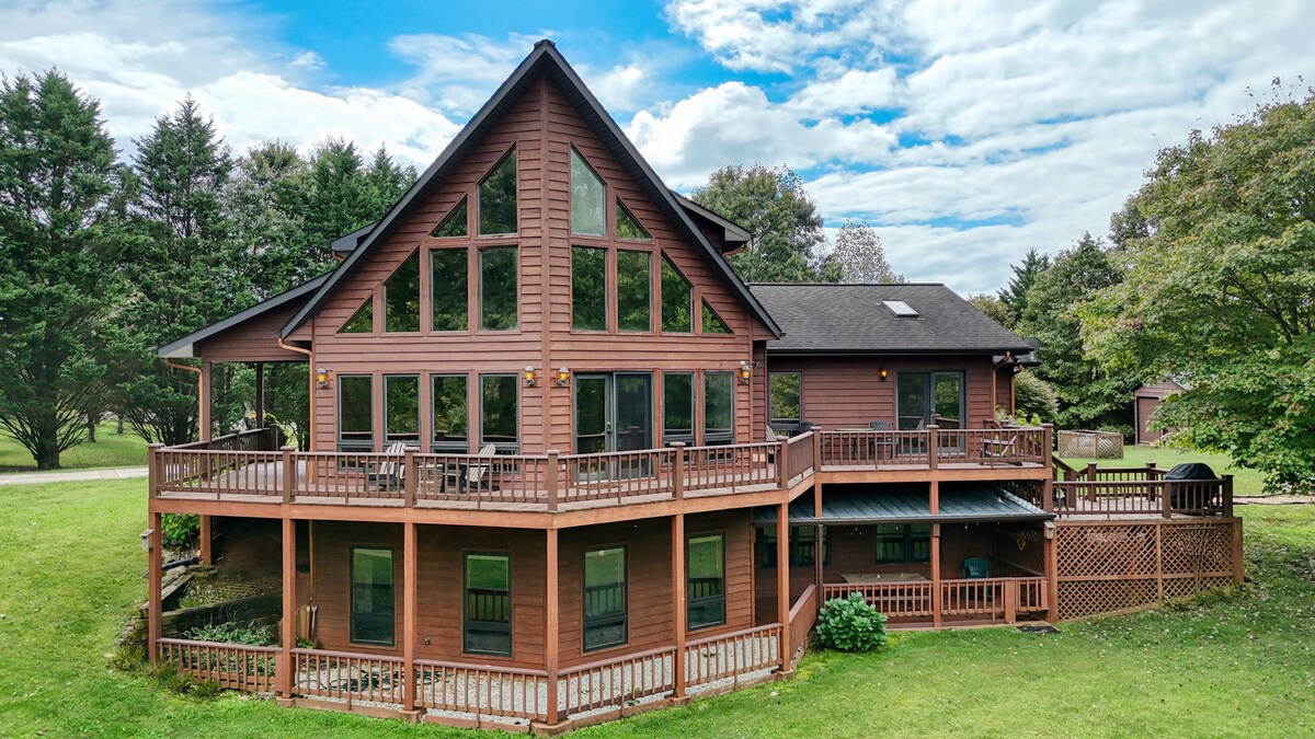 Commanding View of Byers Creek from the wide wrap around porch to relax and reconnect with nature, enjoying the views while reading your favorite book in one of the several rocking chairs.