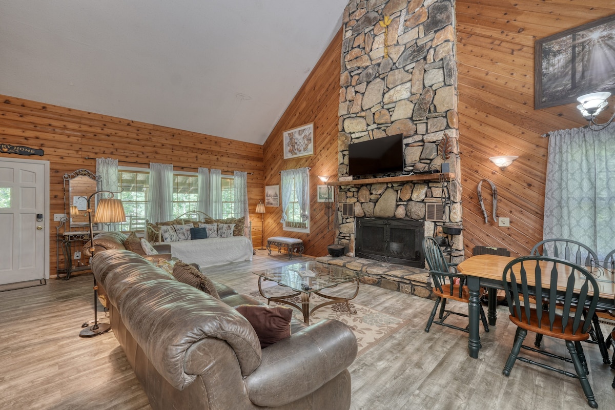 A floor-to-ceiling stacked rock fireplace in the living room welcomes weary travelers to relax and unwind while enjoying the mountain and meadow views from this quiet cabin in the Northeast Georgia Blue Ridge mountains. Walls of tongue-in-groove knotty pine give warmth to the main rooms, which are accented with maple floors.