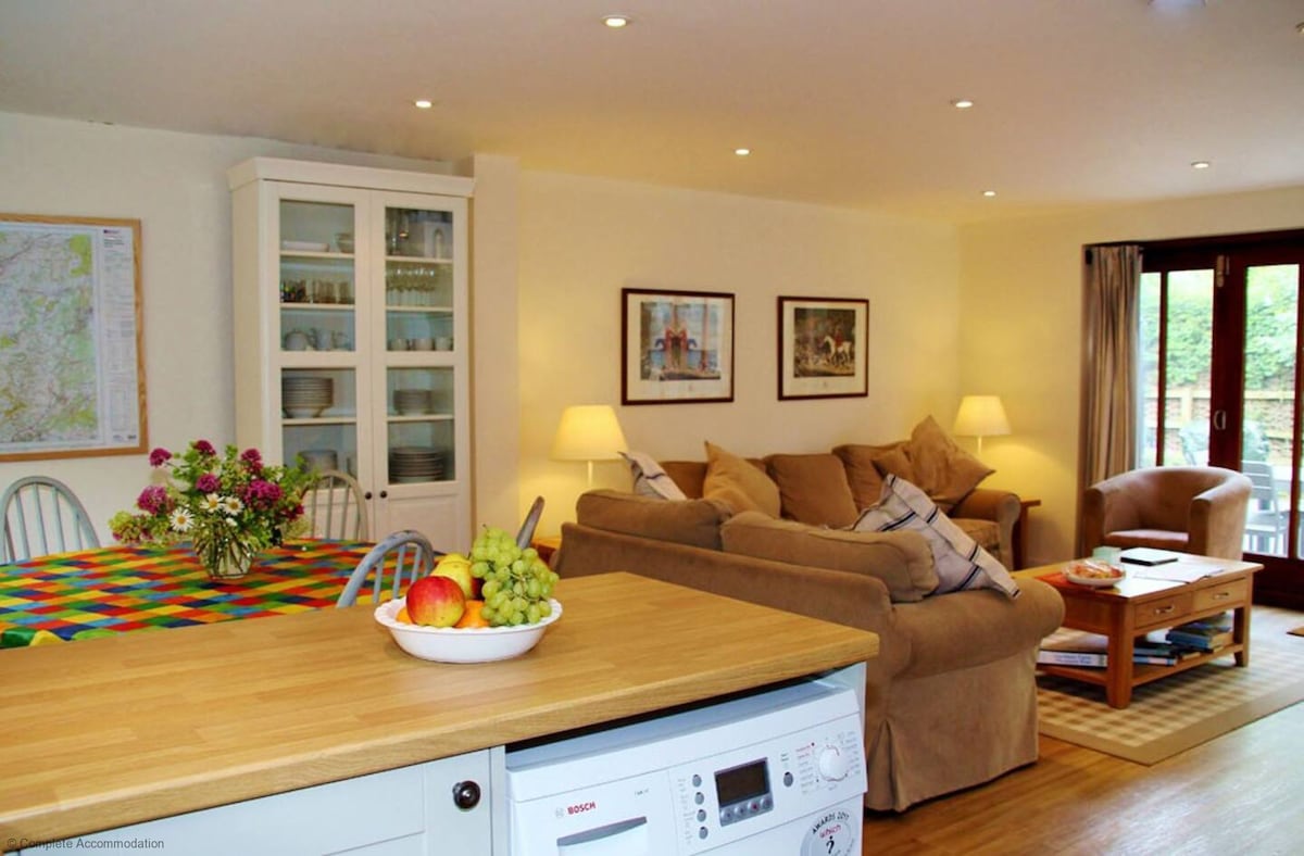 A superb 3 bedroom holiday cottage in Newton Valence, Hampshire, with a beautiful open plan ground floor living space with large sliding doors onto the shared external patio and a double height vaulted space looking up to the first floor gallery above.