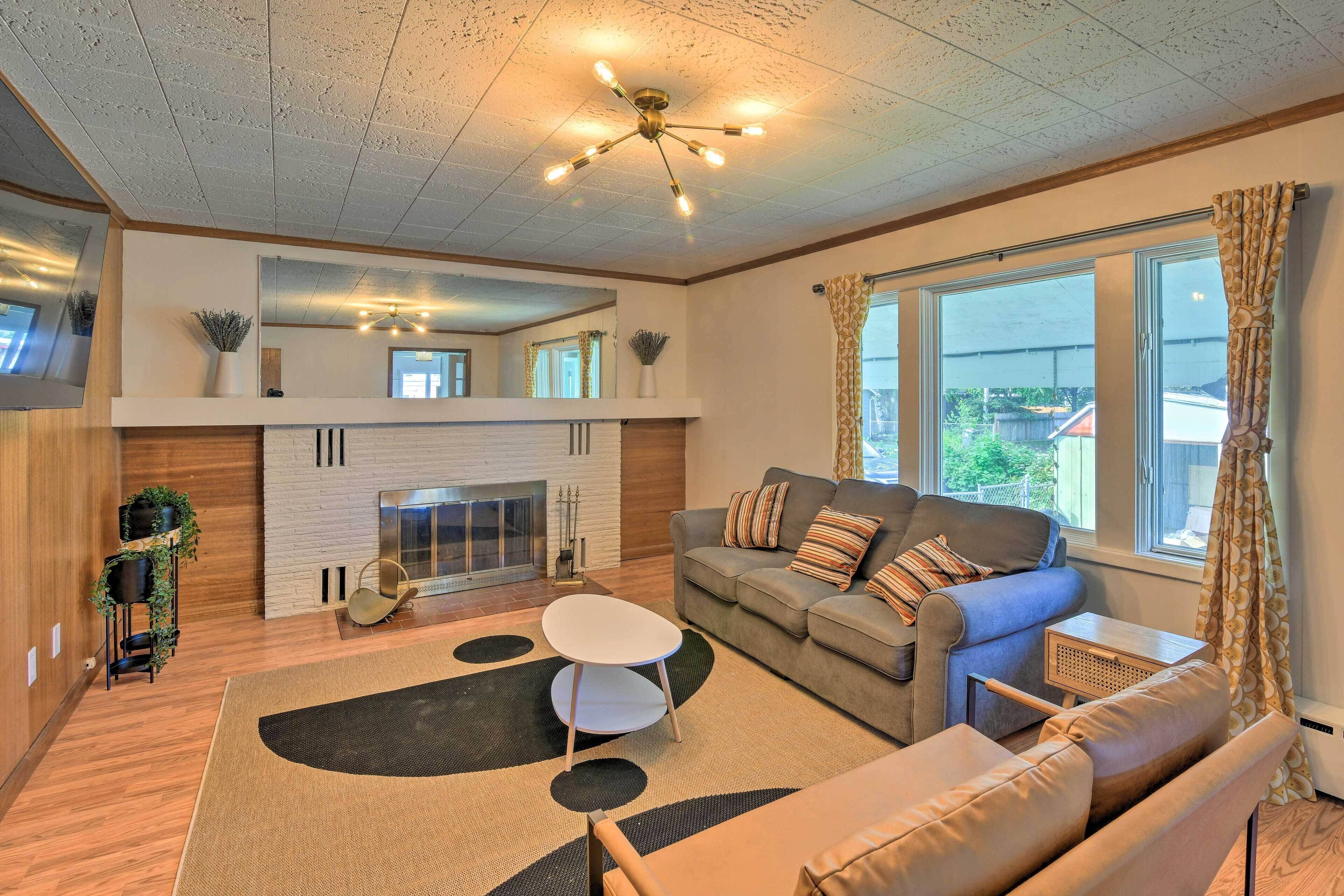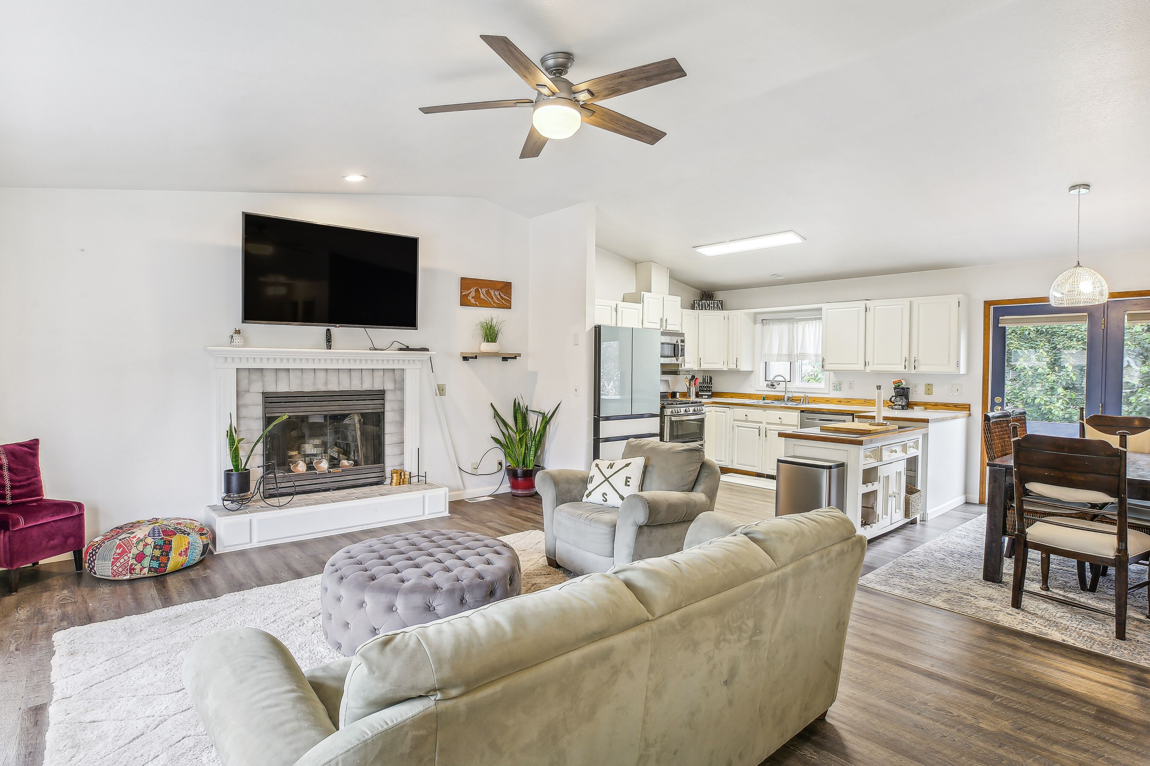 A living room, a fireplace, and a ceiling fan are featured at this 3-bedroom, 2-bathroom rental. Enjoy the free WiFi and TV. The kitchen is equipped with an oven, a stovetop, and a dishwasher, as well as a coffee maker, an ice maker, and a microwave. Other amenities include bed sheets, an ironing board, and heating.
