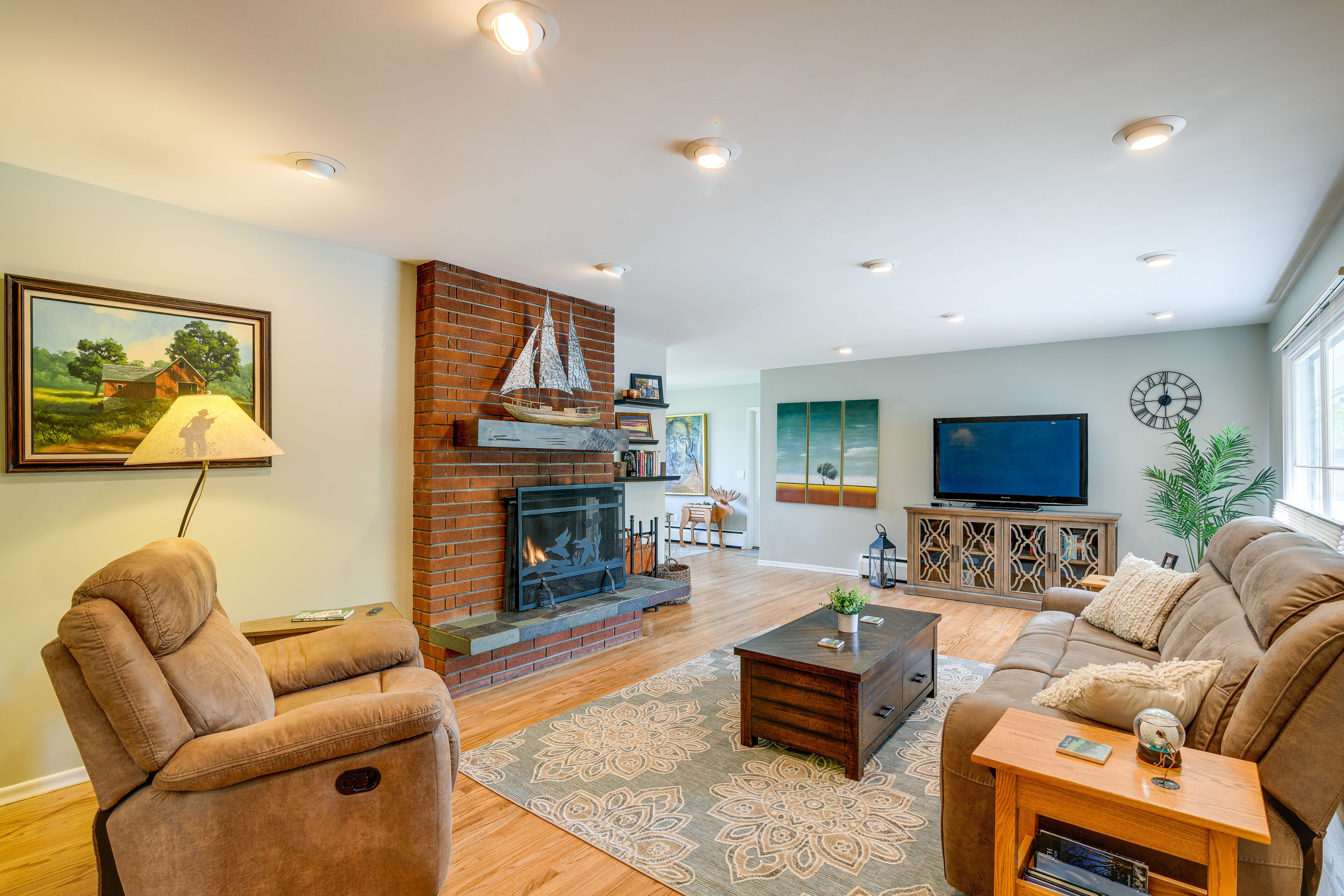 A living room, a fireplace, and a ceiling fan are featured at this 4-bedroom, 3-bathroom rental. The kitchen is equipped with an oven, a stovetop, and a dishwasher, as well as a coffee maker, an ice maker, and a microwave. Other amenities include bed sheets, an ironing board, and heating.