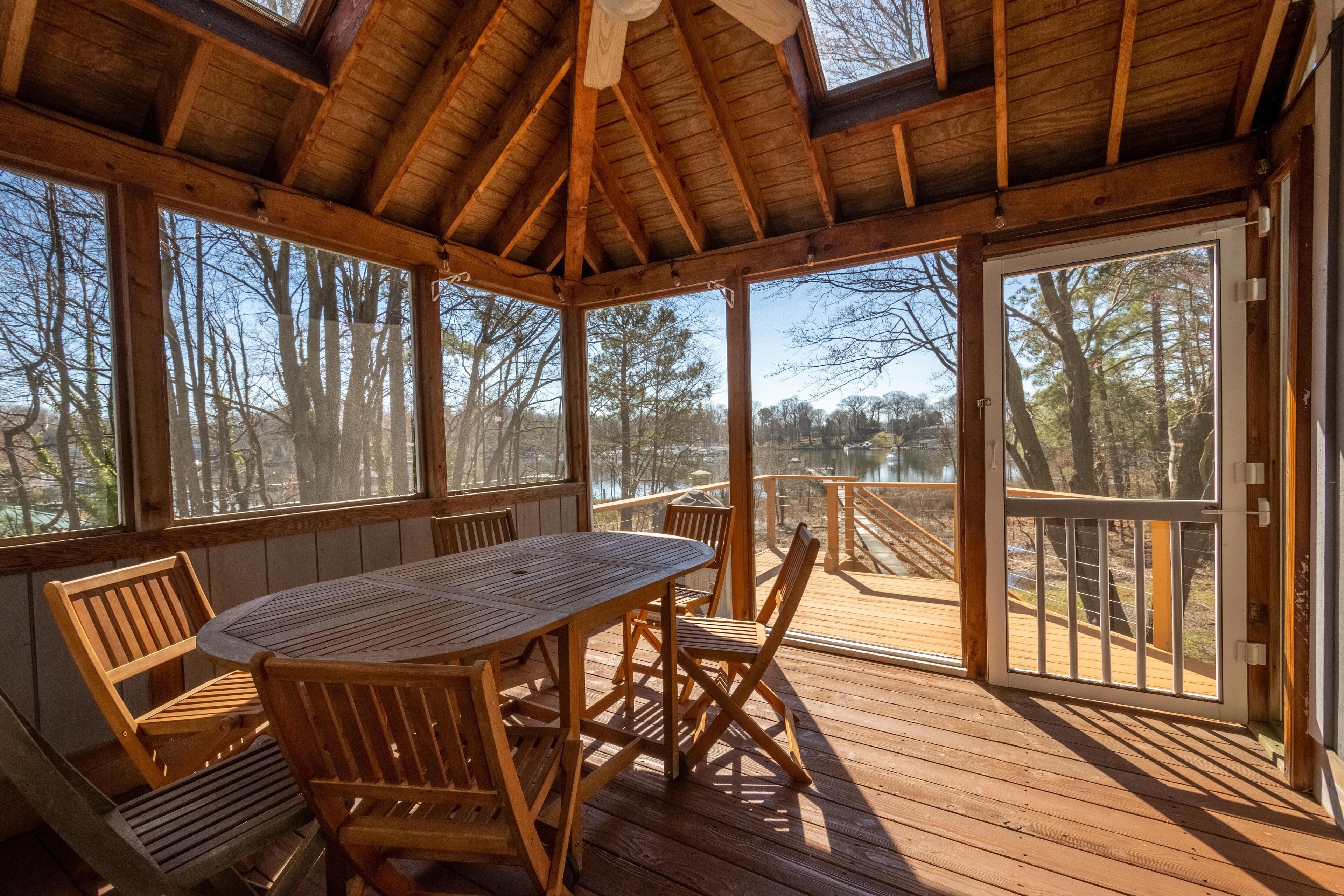 Originally a guest cottage, it does sit behind the main house and requires a short walk on its own private access to its own private dock. The dock overlooks a couple of marinas on the quiet protected waters off of the South River. It is equipped with a boat lift and jet ski lift which is available to the avid boater, if they so choose. Because the property is so close to the South River, it is a short boat ride to Thomas Point Light House, downtown Annapolis, and a variety of boat up restaurants. The house comes with two kayaks which is an excellent way to explore the back waters. The dock is a wonderful spot to fish, crab and even swim. The evening sunsets enjoyed from either the large house deck or on the boat dock are magical.