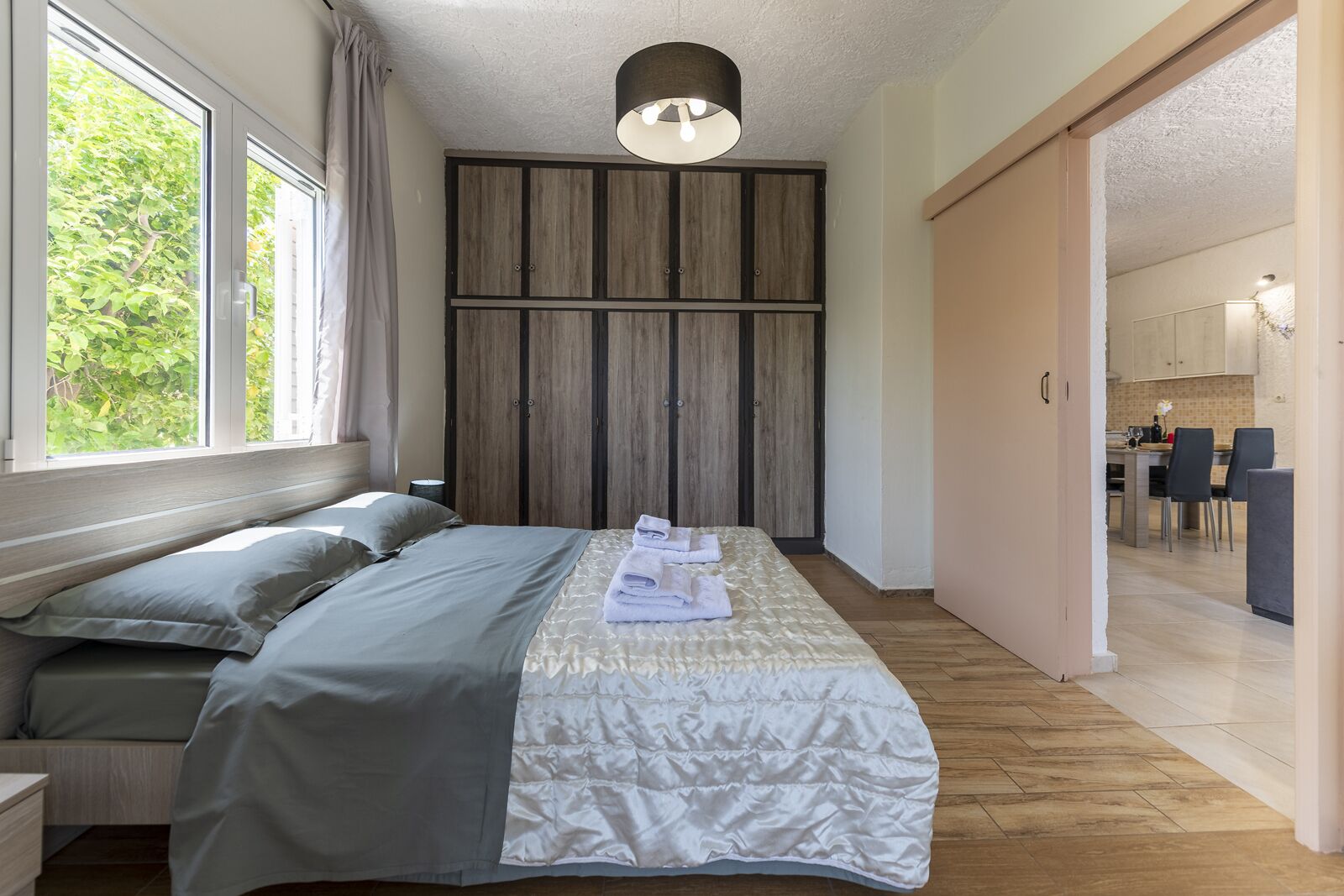 Α countryhouse 65m2 with a 400m2 garden only 50 minutes from Athens. It consists of two bedrooms with 2 big double beds (a small foldable single bed can be offered upon request) one bathroom, kitchen with all the electrical equipment (oven - fridge - microwave - toster - espresso machine - filter coffee - juicer) and everything else needed , a big living room , front balcony overlooking the beautiful garden and rear patio for your relaxation and reading. There is air conditioning off course and both bedrooms have ceiling fans. Also there is private space in front of the house for parking. It is located 40 meters from the sea and at approximately 400meters is a well known windsurfing and kite surfing spot. All the beach bars and organised beach is at a 5 to 7 minute walk (600 -650 meters away) Also the centre of the village of Chalkoutsi is at a 850 meters walk by the picturesque seaside paved road ( ideal for evening strolls) where you can find everything from restaurants and tavernas to cafes and supermarkets and an amazing summer movie theatre. Also a bicycle will be offered during your stay for ease with the groceries. The town of Oropos is 5km away where you can take the ferry ( half an hour trip) to the island of Evia and the small town of Eretria. Buses to Oropos and Athens from Chalkoutsi are leaving every hour. Bus stop is 850 meters from home. The placement of the house makes it perfect for relaxation and recharging while being close to everything you can ask.