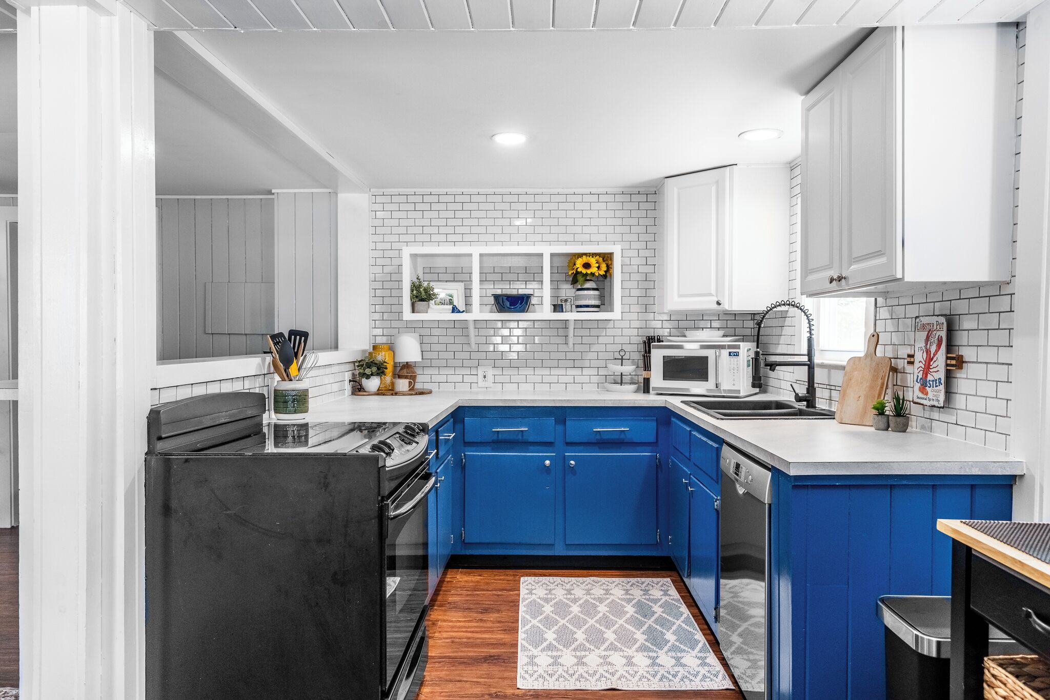 The kitchen is equipped with a fridge, stove, toaster oven, crock pot and microwave. The kitchen sink has a filter for drinking water. Kitchen set-up includes plates, silverware, bowls, pots, pans, glassware, mugs and a lobster pot!