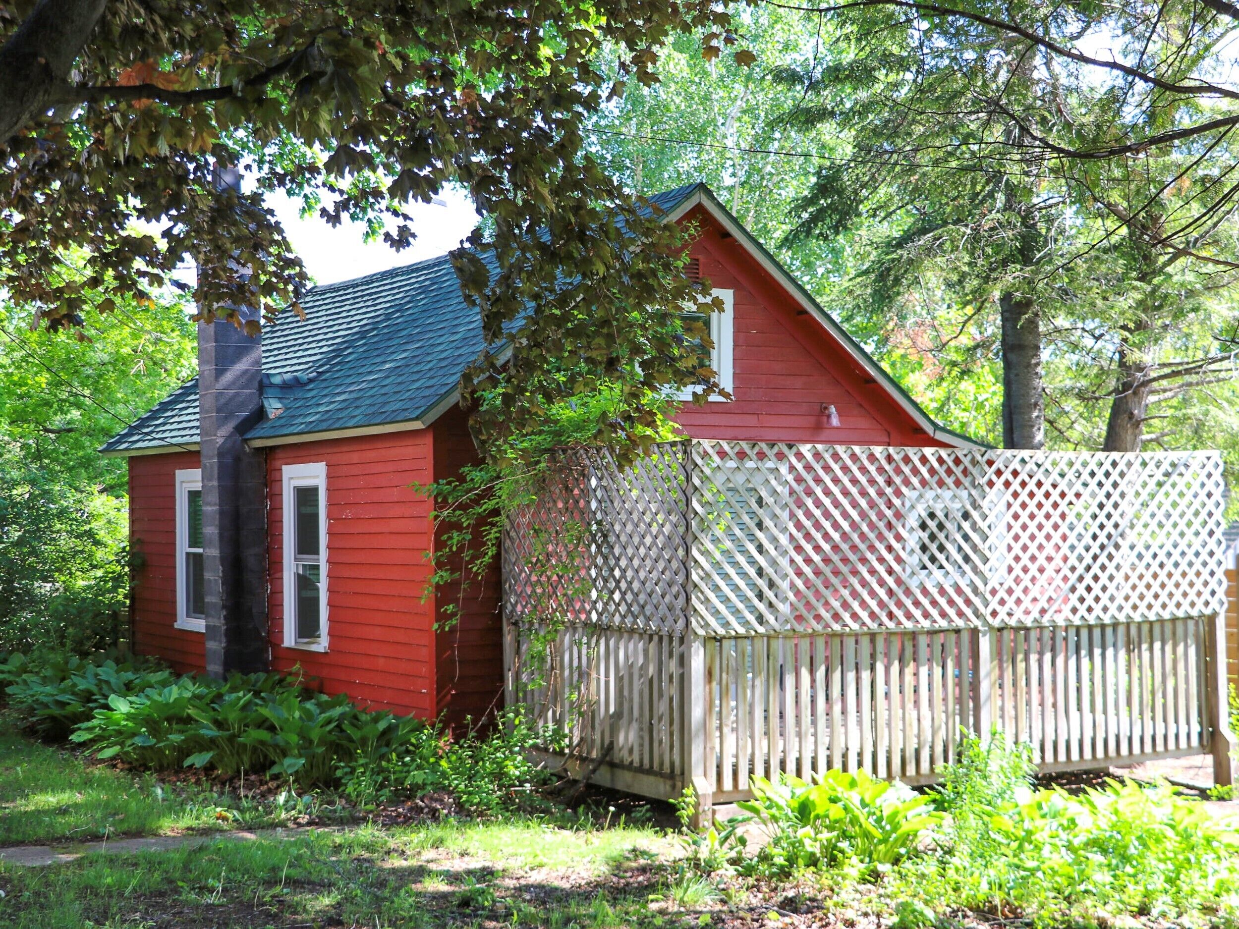 Featuring the Main Cottage with a one thousand square foot wrap around deck and outdoor dining in front, the queen master bedroom offers French doors that bring you to the back deck to two outdoor lounge chairs perfect to relax and have a morning cup of coffee while the morning sun rises. The living room has two huge unique panoramic reflective windows surrounding you, giving you views of the northwoods and wildlife (reflective windows means you can see outside, but the wildlife cant see in!) The main cottage also has a full kitchen and bathroom with a skylight and heat fan, vaulted ceilings throughout the cottage giving plenty of natural light. Cozy up next to the propane fireplace/stove in the living room while you enjoy the wooded views.