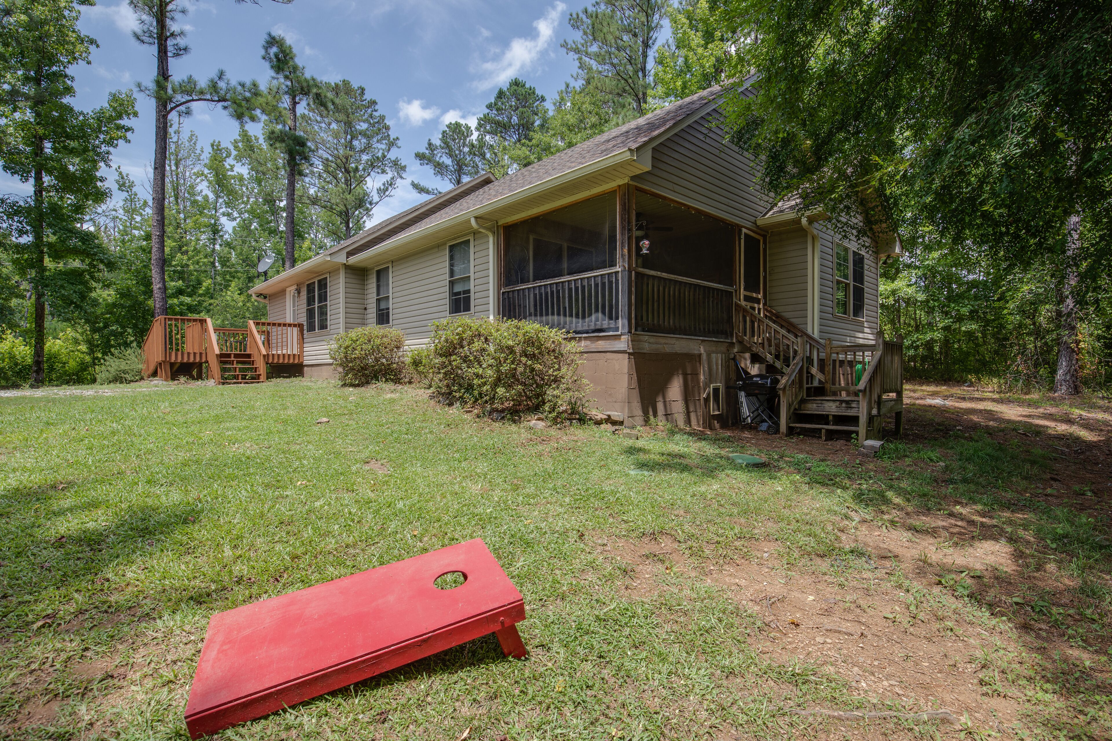 A spacious deck, nestled among the trees, surrounds the back and provides ample space for dining, grilling, unwinding, and gazing at stunning sunsets overlooking the lake.