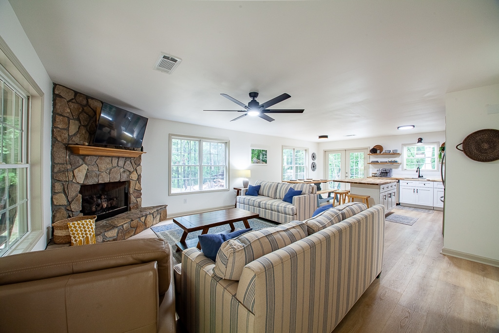 Upon entering the cottage, the floor plan is open and one-story which is great for seniors and toddlers. The dining room, just off the kitchen, has a unique, live edge handmade wooden table and ceiling fan.