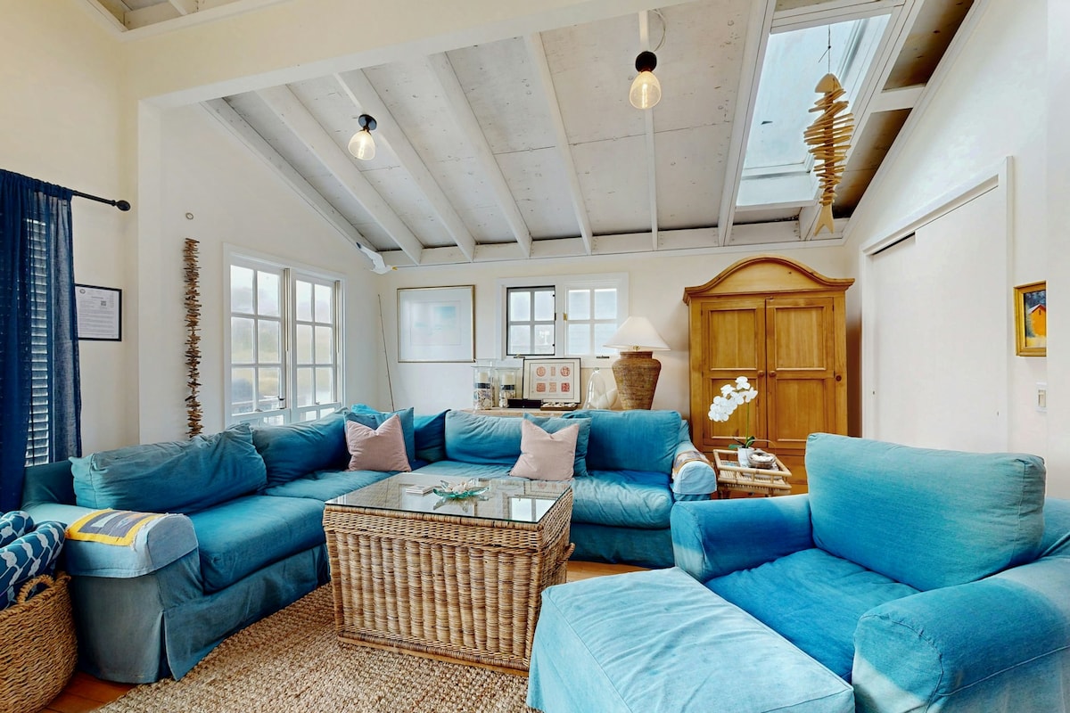 Our spacious 1600 sq ft. floor plan is perfectly designed for up to three couples, or a larger family. It is also ideal for “Girls (or guys) Get-aways.” Maximum capacity is 6 adults. Our Great Room with kitchen, dining/living areas with an effortless gas fireplace is connect by French doors to our family room, with a 40' smart TV and Blu-Ray. So, when the “youngsters” and the “young at heart” in your group are ready for some space of their own, you simply close the French doors! All are furnished with comfortable, cozy furniture, decorated with a fisherman’s cottage theme.