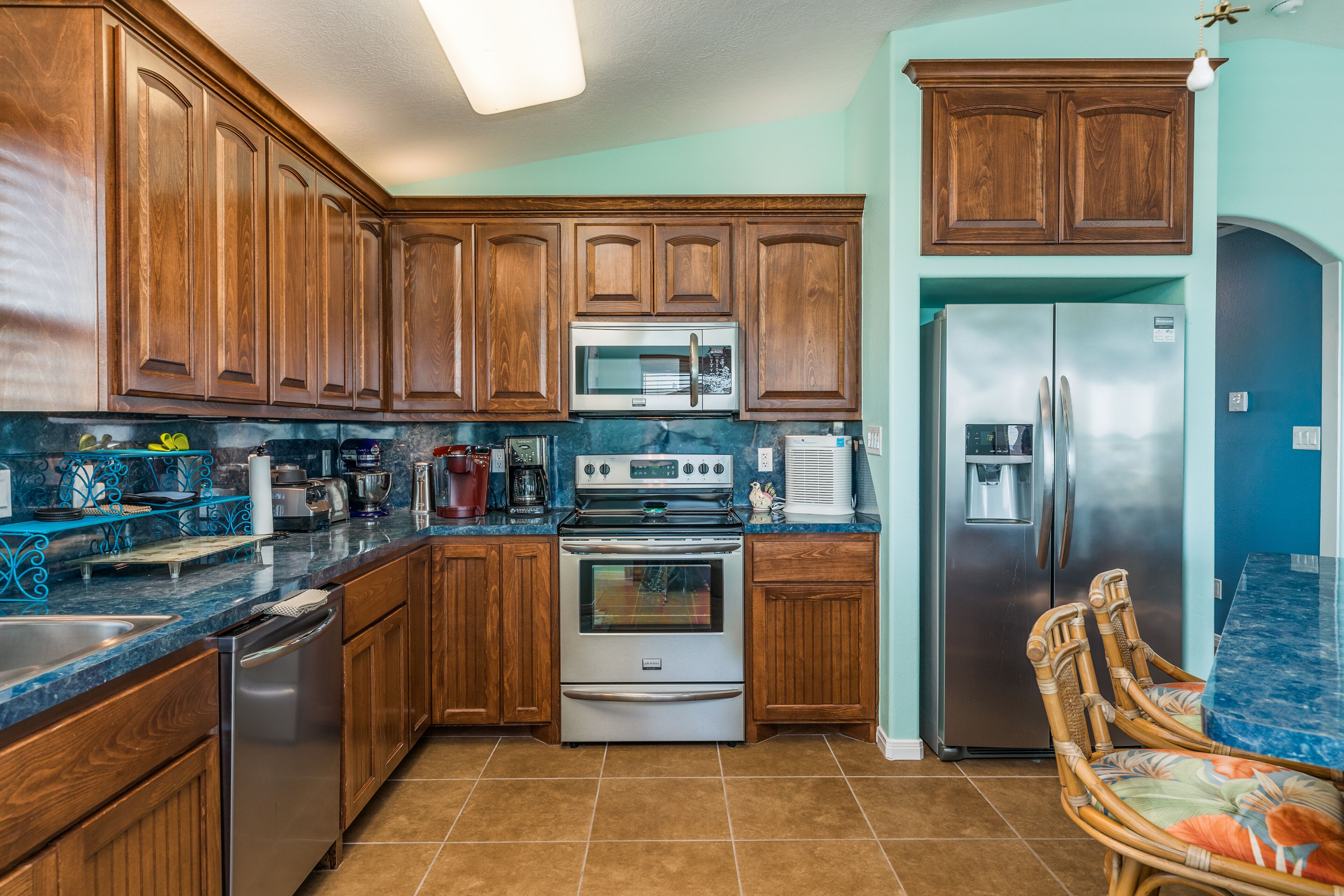 Decorated with vibrant prints and cheerful shades of blue, the living space features tile floors, plentiful seating, and satellite TV. Flip on the ceiling fans to circulate the Gulf breezes, use the stainless steel appliances to whip up pancakes in the kitchen each morning, and bring your coffee and newspaper outside to the wraparound deck to admire the Gulf view.