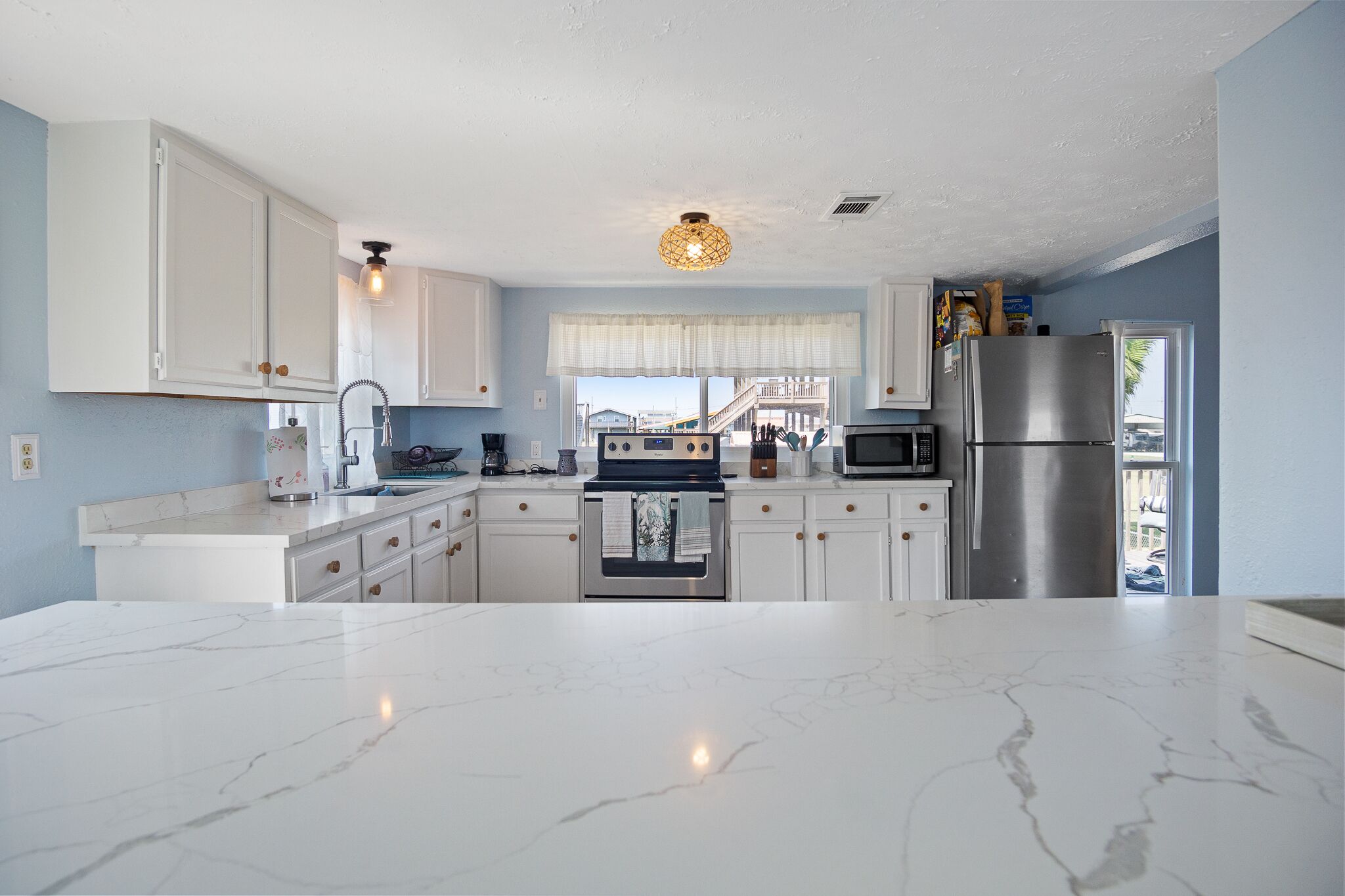 Our home is centrally located in Crystal Beach with shops and restaurants just a 2-minute drive away! Or, you can stay home and sip coffee on the back porch while listening to the sound of the waves