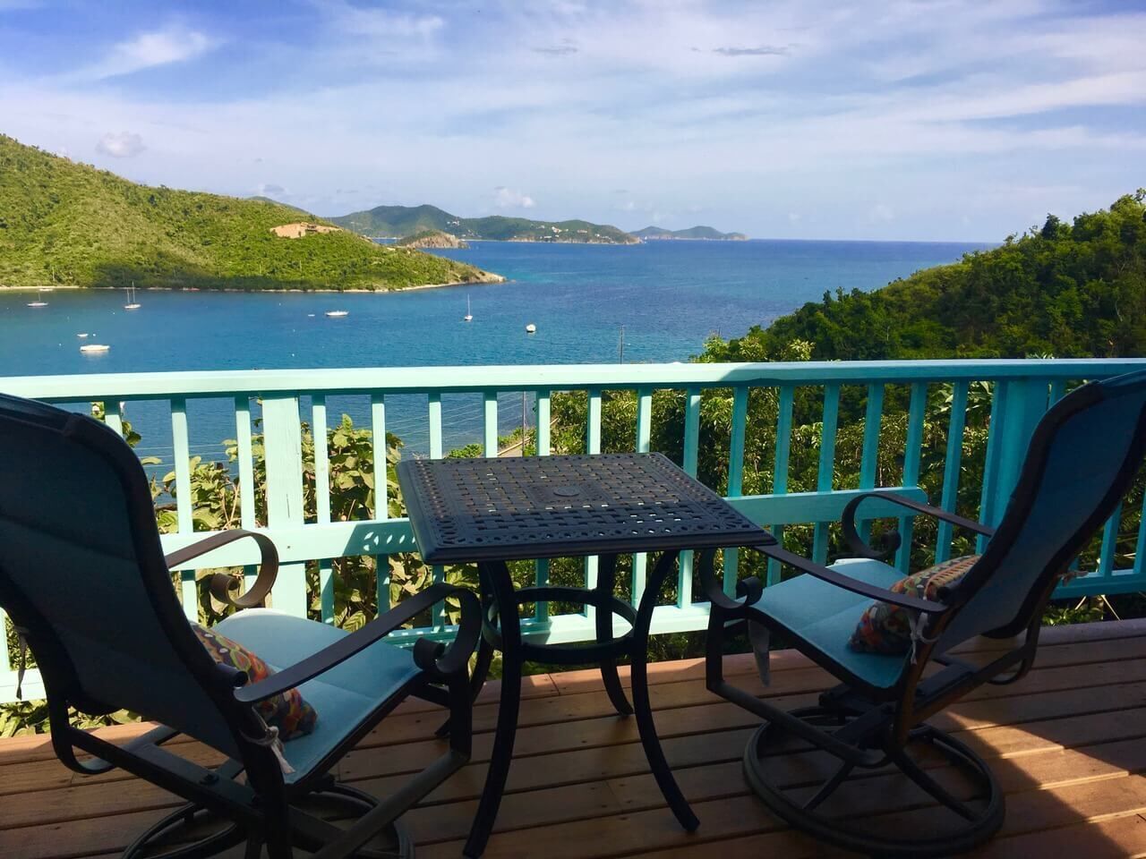 Enjoy views of Coral Bay from rooms, or deck looking out over the boats at anchor, the lush green of Fortsberg. The gentle breezes carry you into a Caribbean state of mind. Palm Cottage is located in Estate Carolina on the south side of King Hill Road. It has a large deck that fronts the ocean view and on the rear a smaller shade deck on the west side provides the perfect morning or afternoon getaway with a view of the valley.