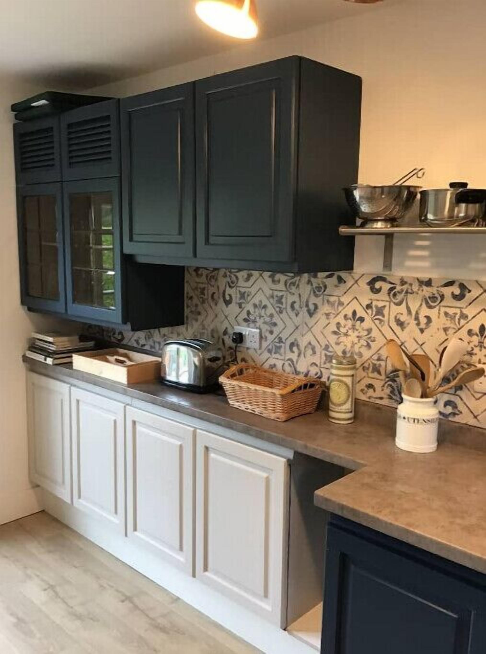 This charming 1930s period property is colour-washed duck egg blue under a tiled roof with dormer windows, arched porch, stained glass window panes, old-fashioned pull doorbell and interior doors of country planking with ironwork handles.