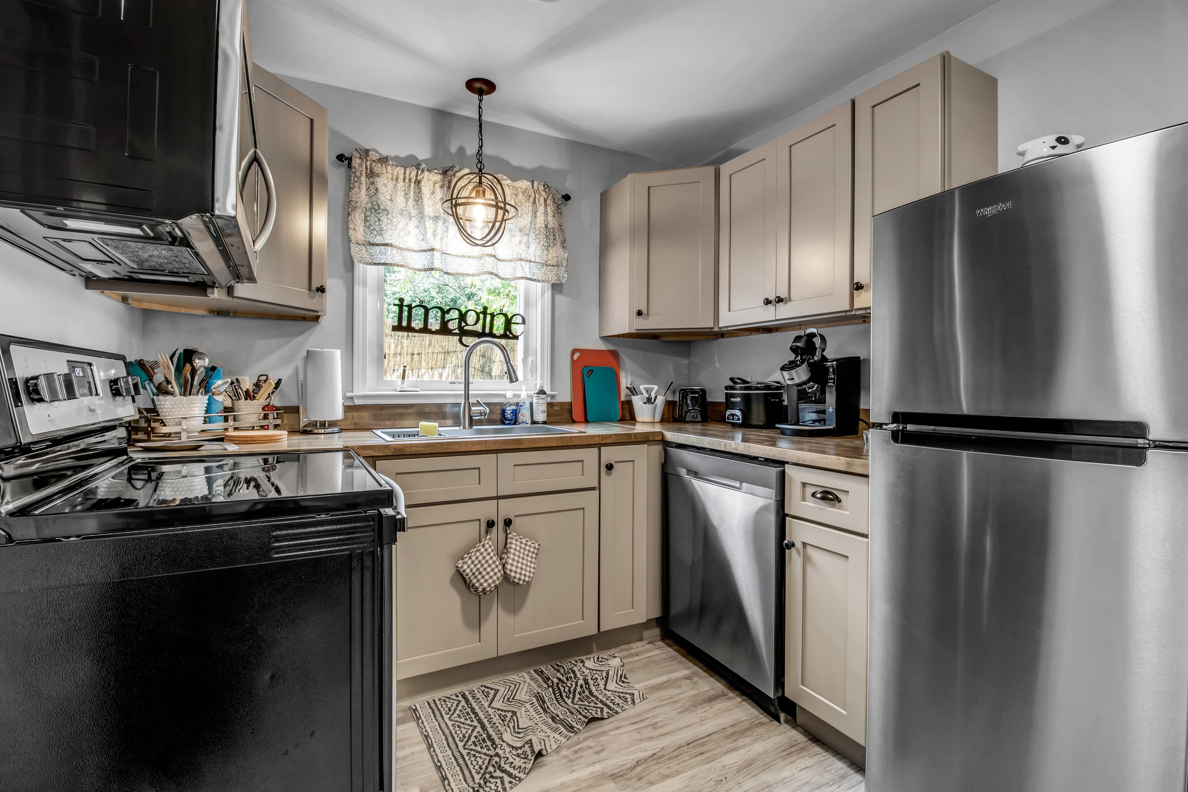 Fully Equipped Kitchen: The kitchen has plenty of counter space for preparing your favorite meals, along with a range, refrigerator, and other essentials. A small island provides additional convenience for meal prep or enjoying a casual snack.