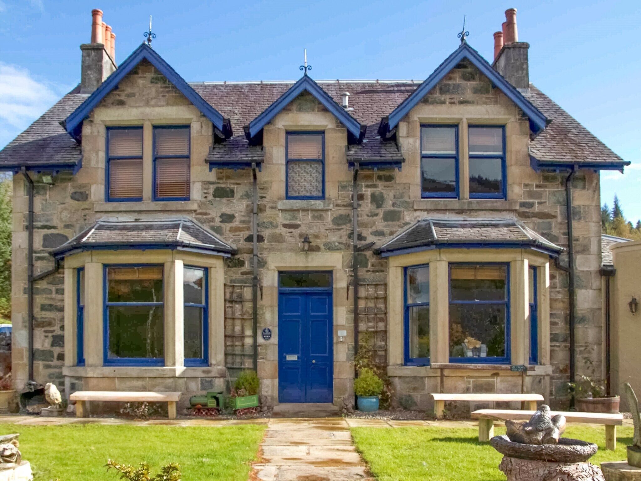 Bedroom 4: With kingsize bed and en-suite with bath, shower cubicle and toilet.. Gas central heating, gas, electricity, bed linen, towels and Wi-Fi included. Initial fuel for wood burner included. Two cots available on request.. Front lawned garden with sitting-out area and garden furniture. Private parking for 6 cars. No smoking.. The impressive Airlie House can be found in the charming riverside village of Strathyre on the eastern shore of River Balvaig near the stunning Loch Lubnaig. Only 15 minutes from the bustling town of Callander and 20 minutes from Killin. Located in the Loch Lomond and the Trossachs National Park set well back from the main road, this beautiful 4 bedroom house is perfect for large family get togethers, groups of friends or special occasions. Ideal for hikers and those seeking stunning scenery and adventure. Don’t forget to bring your pets as there are plenty of walks very close by. On entering the house into the foyer, you can hang your coats and leave your muddy boots. Relax in the living room by the wood burner and admire Ben Sheann right in front of you or grab a good book from the small library selection. Head through to the well-equipped spacious kitchen where you will find plenty of workspace to prepare special meals and entertain. There is a dining room next to the kitchen, but there’s also lots of space to sit and have an informal snack or cup of coffee. Downstairs is wheelchair accessible with direct access from the car park to the house. All four bedrooms are spacious with en-suite facilities. Beds are either kingsize or super kingsize and a sofa bed for two children is in one of the bedrooms. This quaint and peaceful village has a well-stocked village shop / post office, a pub and a restaurant. This area really is beautiful with plenty of walks and cycle paths right from the front door. Explore the Rob Roy Way, maybe visit Go Ape, Blair Drummond Safari Park, take a Loch Cruise, go fishing, visit a Wildlife Centre or Distillery, take a Landrover Safari to try spot deer and the elusive golden eagle - all on hand to make your holiday very special and you’re only an hour from Loch Lomond, Glencoe, Edinburgh and Glasgow.