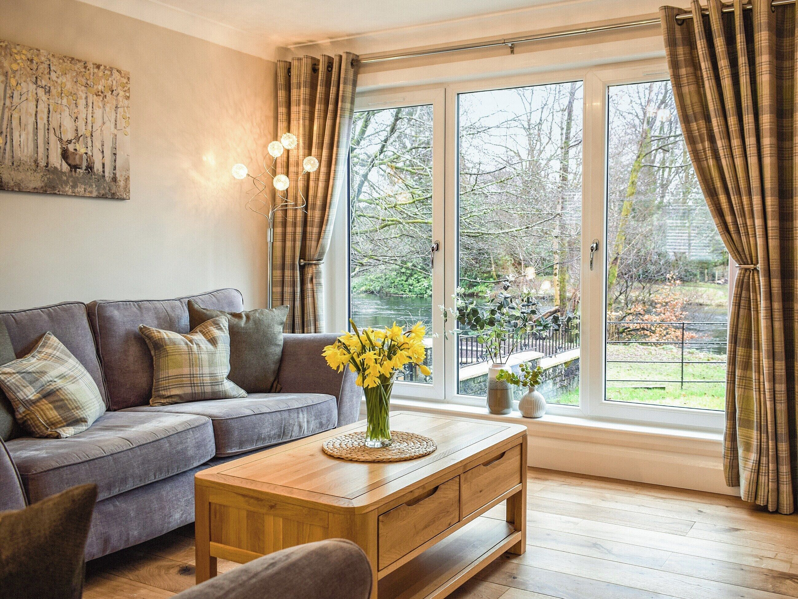 Shower Room: Cubicle Shower, Heated Towel Rail, Toilet. Gas central heating, gas, electricity, bed linen, towels and Wi-Fi included. Travel cot and highchair available on request. Welcome pack and doggy extras. . Large lawned garden (shared with other properties on-site). Private parking for 1 car; additional on road parking. No smoking.. Quietly nestled away in the picturesque town of Callander and offering fabulous views of the River Teith and Ben Ledi in the Loch Lomond and the Trossachs National Park, a perfect location for a relaxing break at any time of the year.