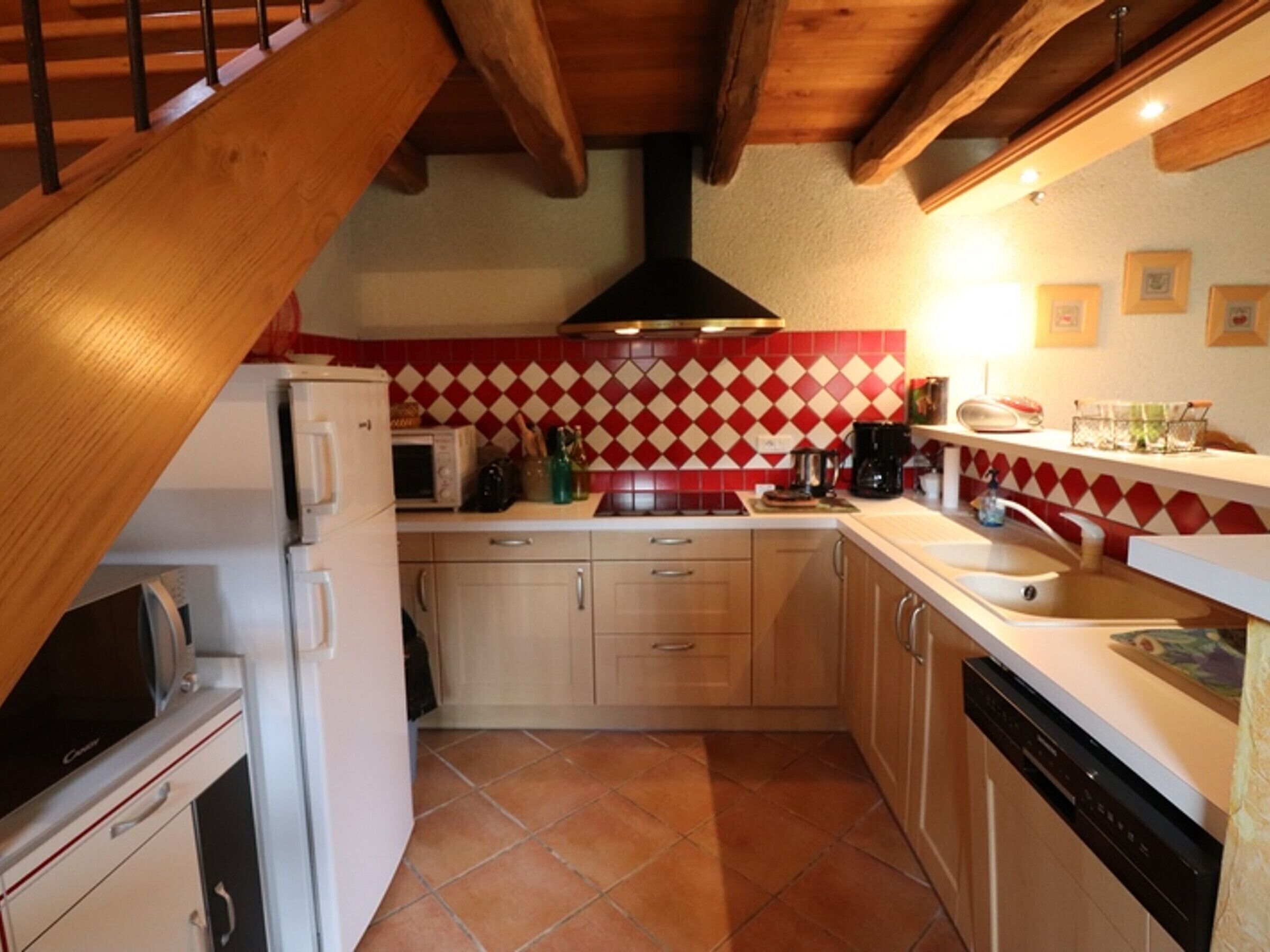 stay 35 m2, cantou (fireplace with stove, wood offered), convertible leather sofa, TV with foreign channels, kitchen (oven, fridge, microwave, dishwasher) washing machine in the basement, bedroom (bed 140 and 90) in mezzanine with blackout curtain (store on velux), bathroom with jet shower, baby equipment (high chair, bed, bath, stair protection barrier)