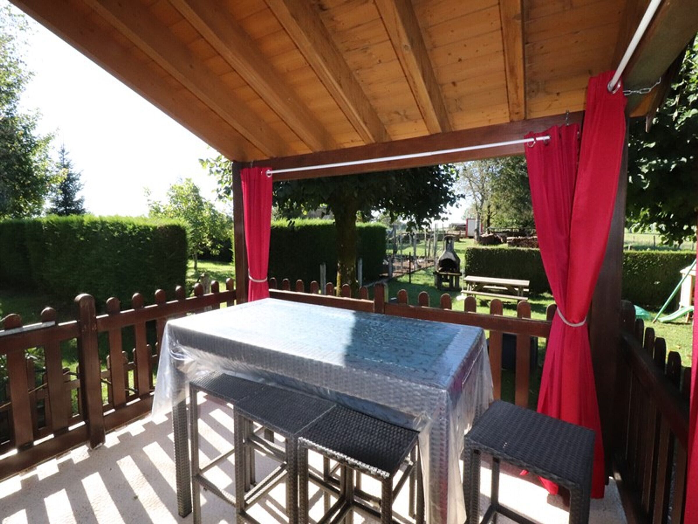 Outside there is a small terrace with picnic table, parasol and a 300 m² private garden with table, chairs, parasol, deckchairs and barbecue as well as a swing. Direct access from the garden to a 6000 m² meadow.