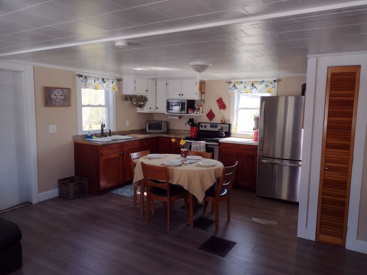 Fully operational eat in Kitchen (microwave, coffee pot, fridge/freezer, stovetop/oven, utensils, dishes, serveware, pots/pans, salt & pepper, oil)