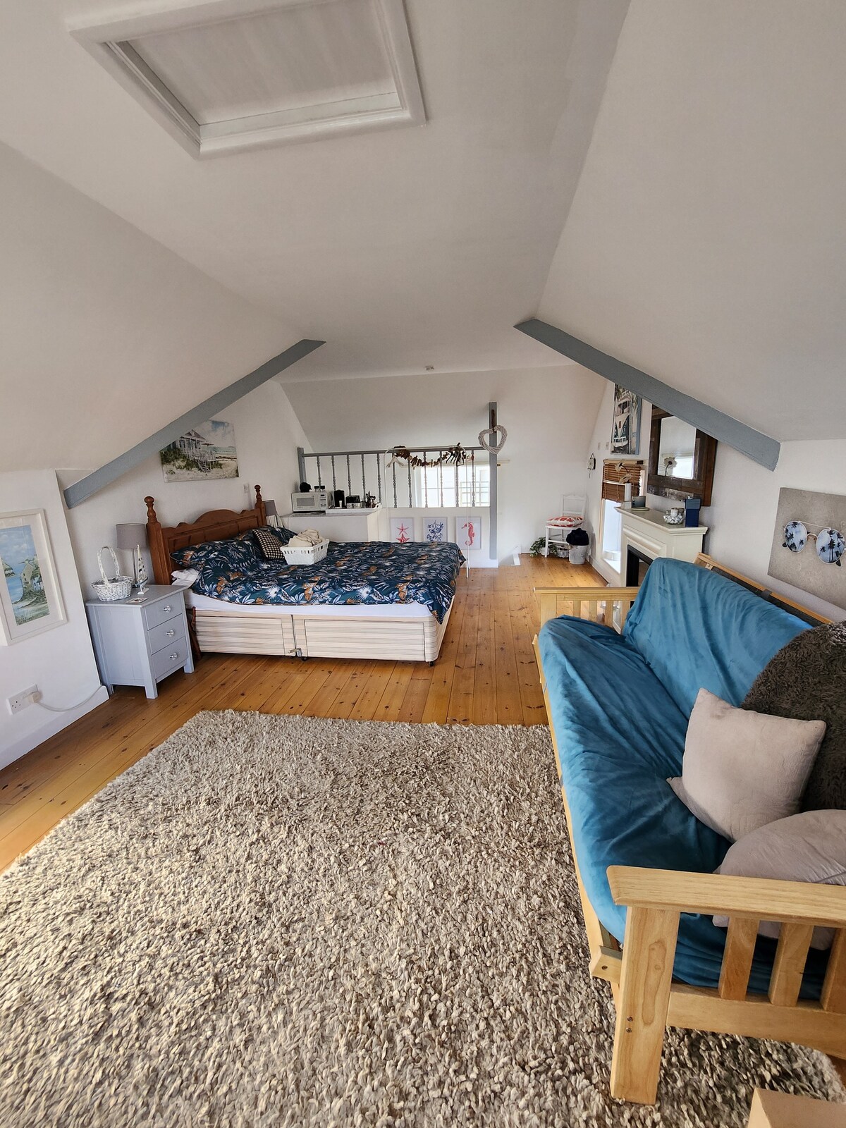 Make your way into the apartment via your own front door at ground-floor level then climb up the stairs to discover your hideaway. Head down to hall to find the beautiful, open-plan lounge/kitchen/diner, which has a vaulted ceiling and is filled with natural light. Make yourselves a cup of fresh coffee in here and find everything you need to help you whip up tasty dinners for two with your own ingredients. Sit down to dine at the table together then recline on the sofa as you watch the Smart TV. Make your way back down the hall when it’s time to lay your head down for the night. The charming bedroom is a king-size and has an en-suite bathroom. Please be aware there is some restricted head-height in this apartment due to the sloping ceilings. This holiday retreat does not have a garden, but guests can amble down to the beach. There is one parking space.