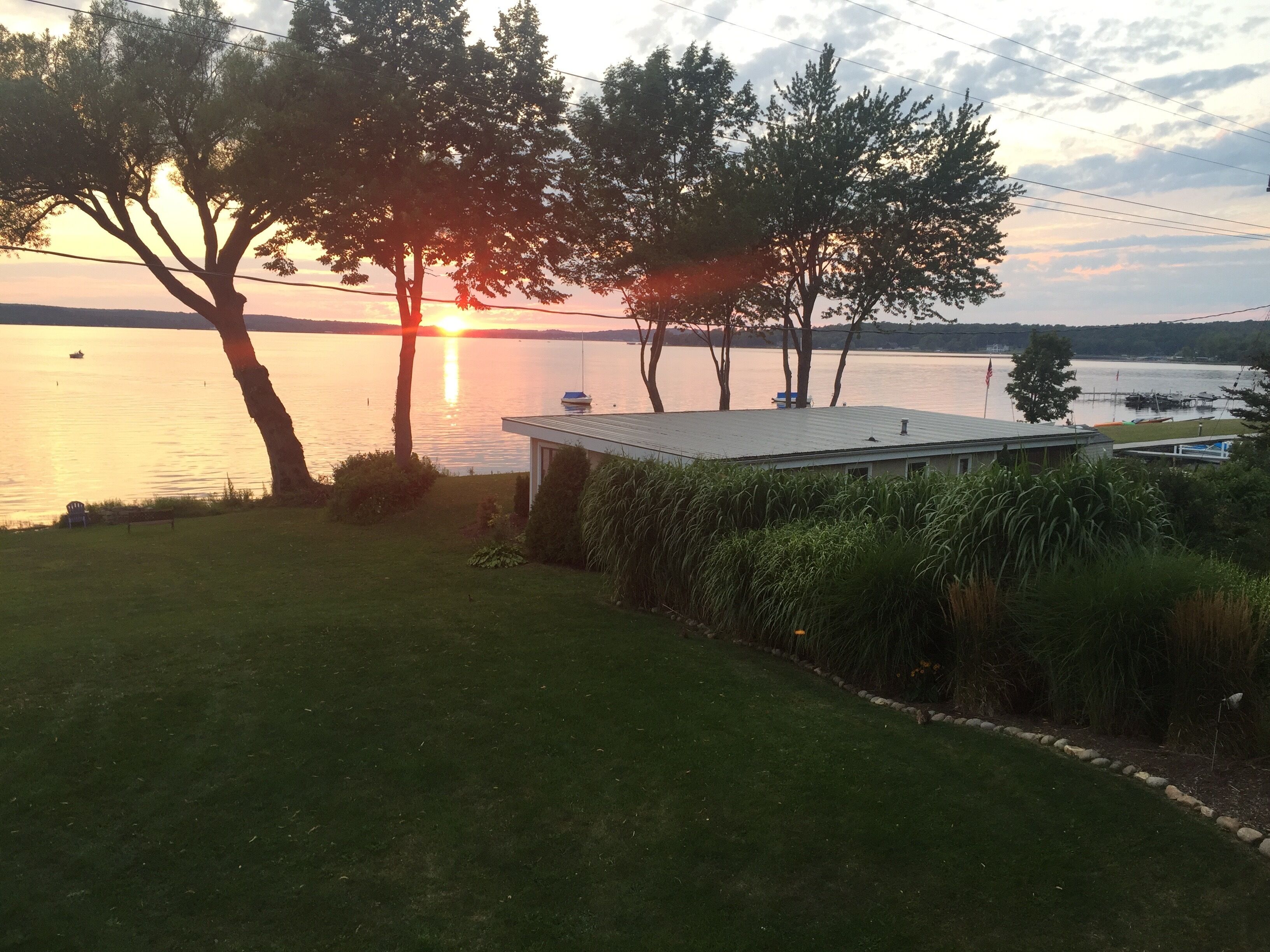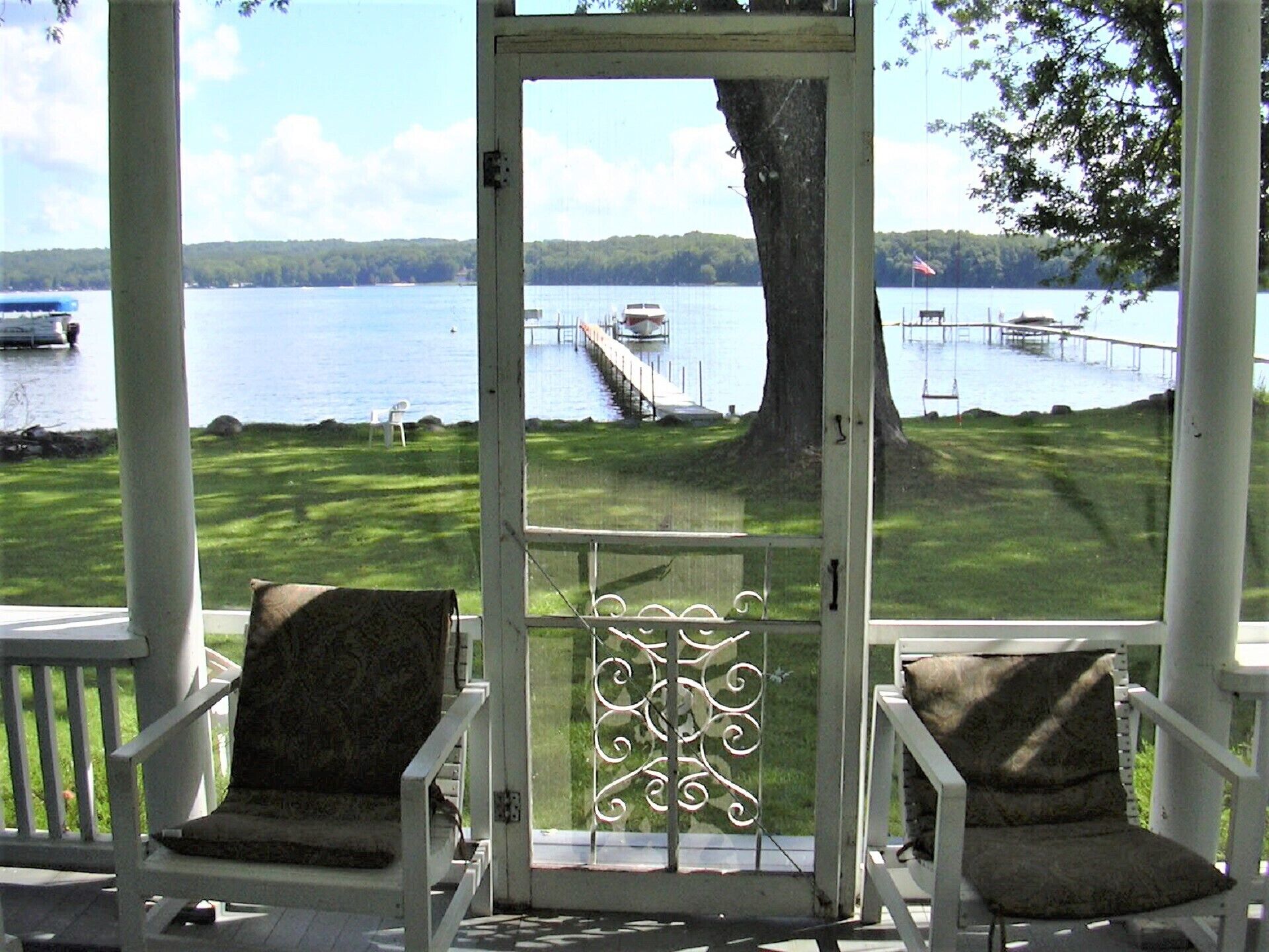 - "We were at the lake to celebrate my father's 90th birthday and a few special anniversaries. We had 10 people staying very comfortably and there is room for more! The cottage is charming and lovingly maintained. There are lovely dishes in the dining cabinets and ample kitchen supplies-pots, pans, utensils, etc. A nice stereo in the dining room supplied our music and the tv was helpful for our rain day. We enjoyed many games around the table. THe lakeside porch and the lake views are the obvious stars of this property, as well as the quiet, family location. The porch is perfect with rockers and wooden porch furniture, pretty blue cushions and commanding views. We sat there early morning and late into the night, just listening to the water lap the dock and the shore. There is a long dock with a bench at the end for sitting and enjoying the lake. A ladder at the end, where the water is 3 or 4' deep, allows easy entry to the lake. The kids and young adults enjoyed floating in the lake and cooling off in the heat. Although there are some very effective ceiling fans in the living room and lakeside bedrooms, if your forecast is for heat, consider bringing a few of your own with some extension cords. We would most definitely stay here again and all the people who visited us during the week loved the location and the house."
