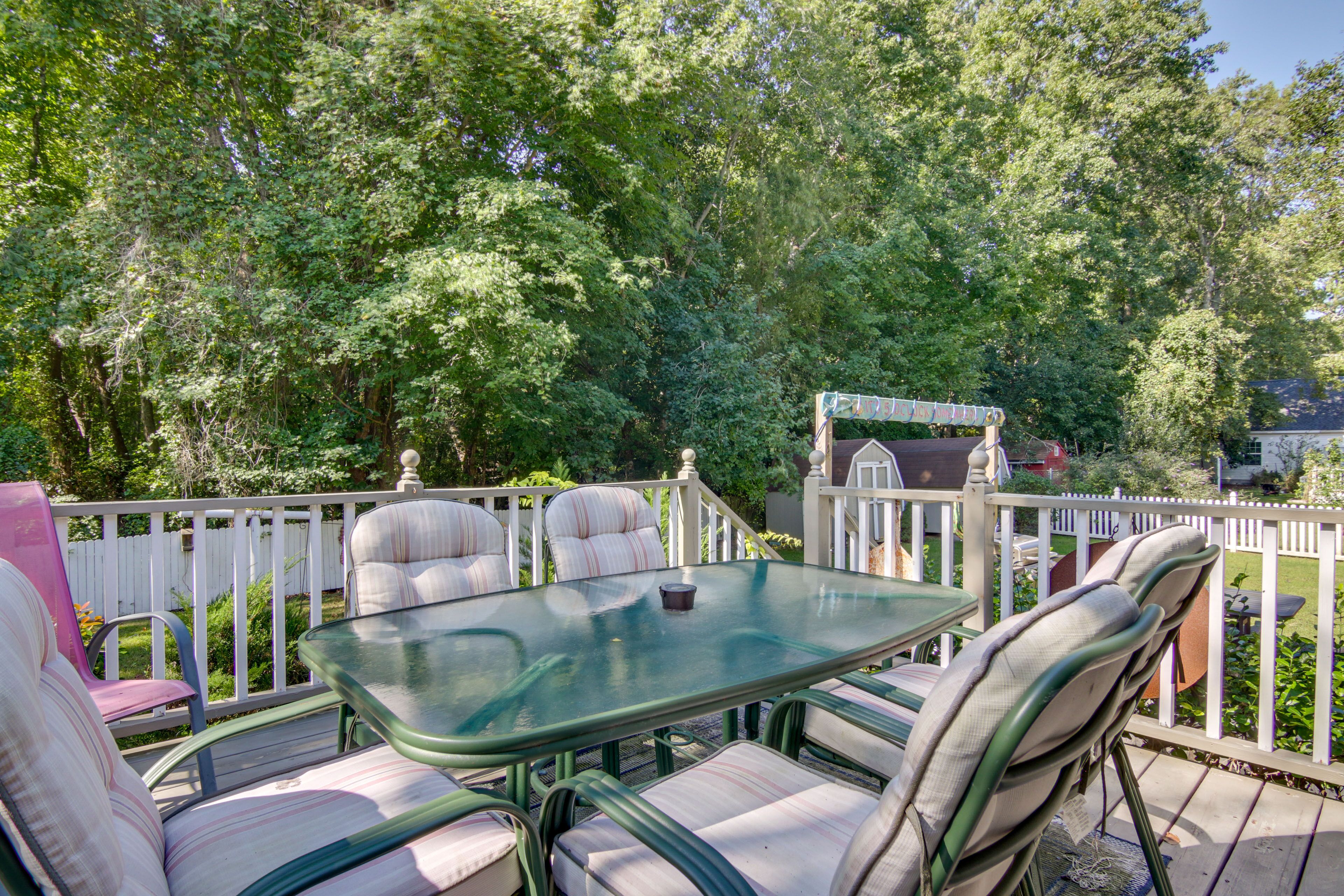 The cottage has 3 cozy indoor seating areas for playing games, reading and working. Free Wi-Fi. The yard has a deck, a patio and a gas grill, plus spectacular hydrangeas and oak trees. Hickory Hickory Dock is your private 80' pier for fishing, yoga, sunning/swimming, drinks/dinner and breathtaking stargazing and sunsets. There is a variety of outdoor seating, such as a chaise lounge, a hammock, a picnic table, a wrought iron ron table with chairs and two kinds of Adirondack chairs. The large sun umbrella, which resides on the deck out of the wrought iron table, to the patio or dock. Umbrella stands are on the patio. Unwind in the sun or shade, work from the deck, patio or sunroom or stroll/bike the island (4-mile circumference).
