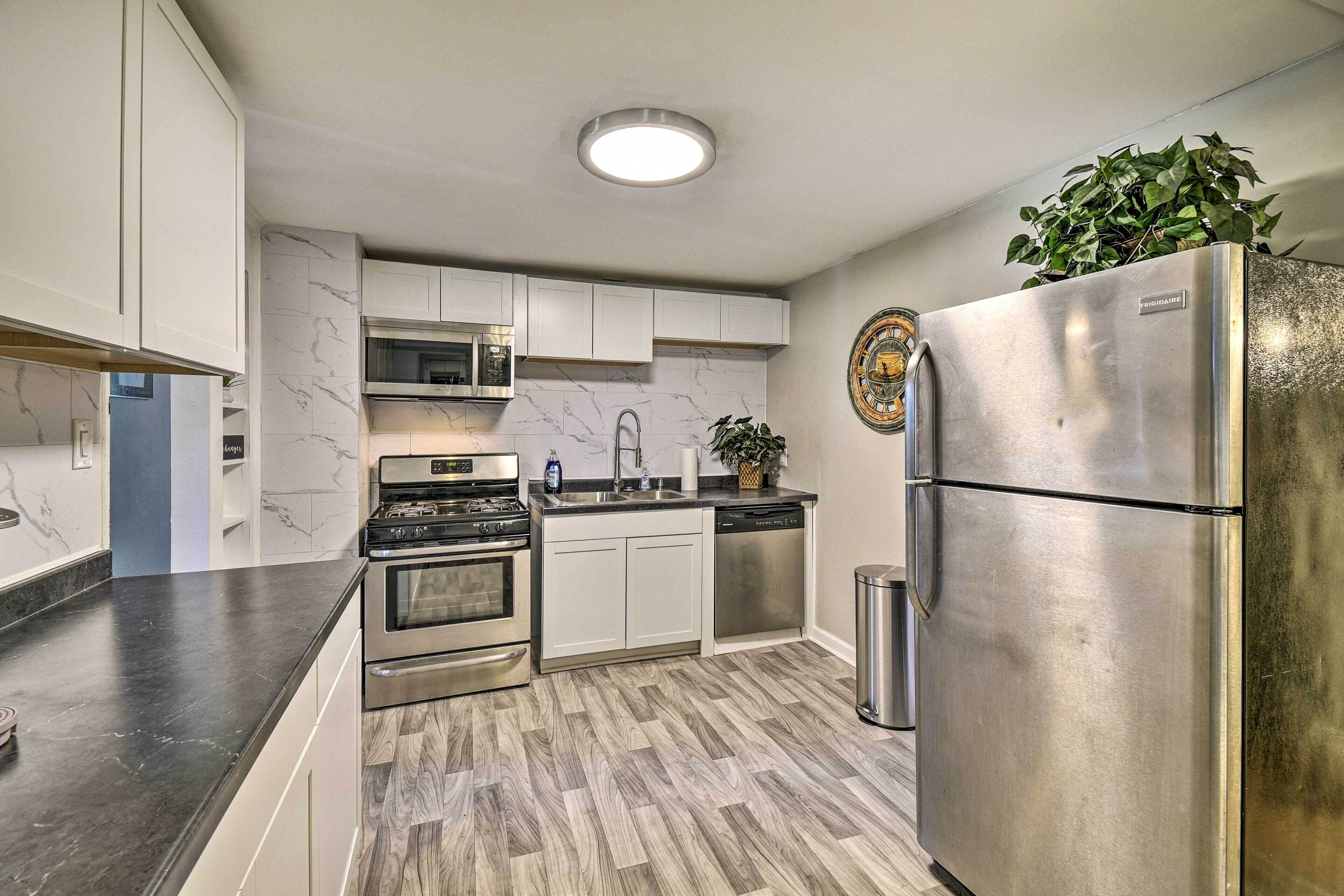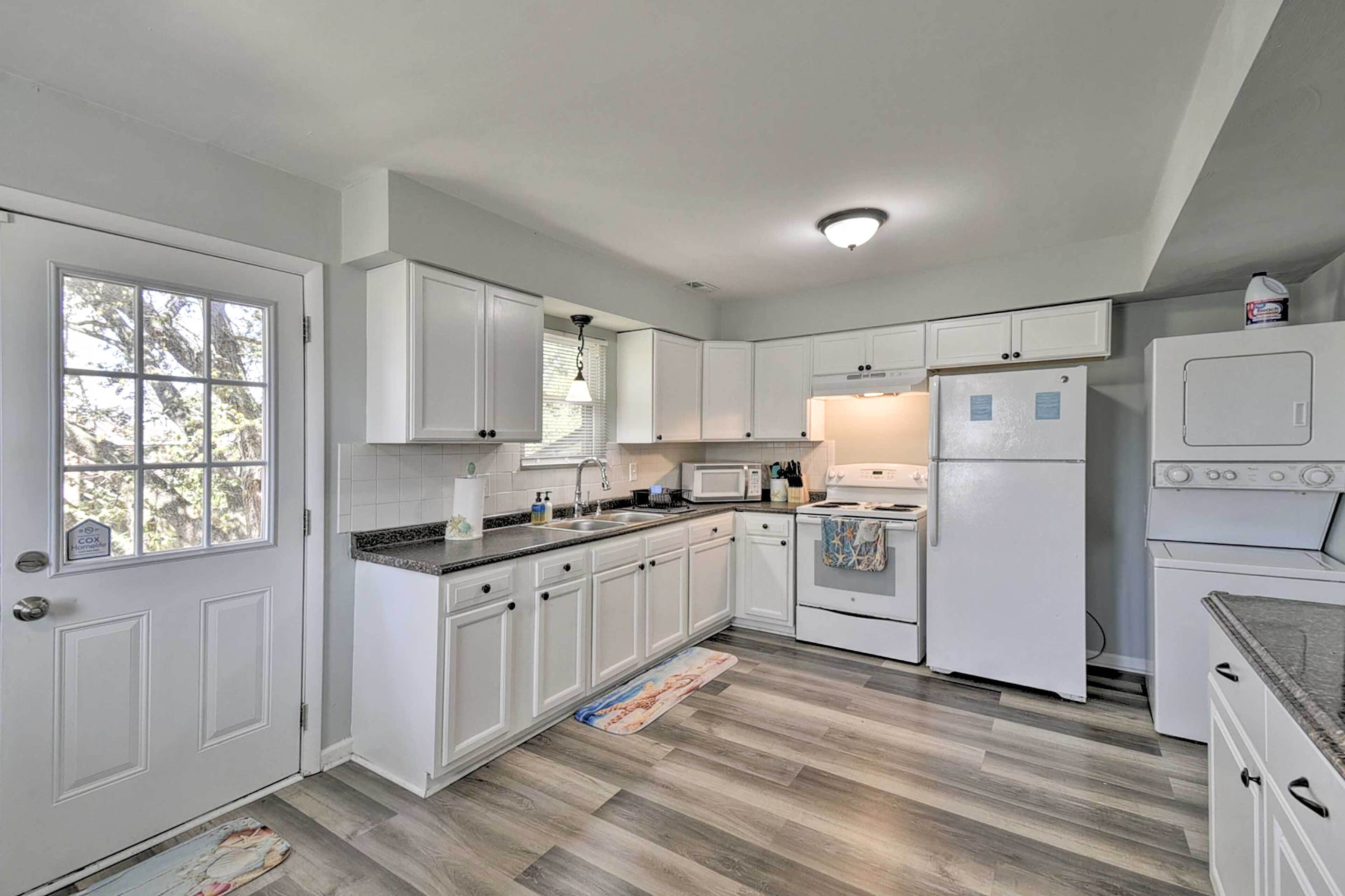 While you're here, you can enjoy all the comforts of home and more, including a seasonal outdoor pool and a full-sized refrigerator/freezer, as well as an oven and a stovetop. Other amenities include premium bedding, laundry facilities, towels, and kitchenware and utensils.