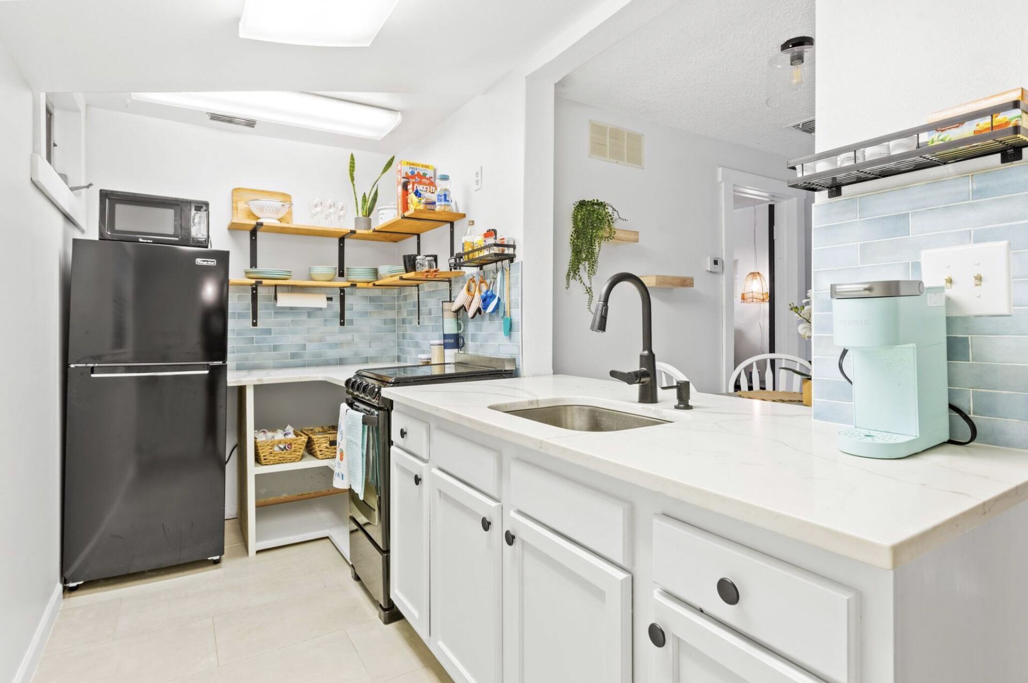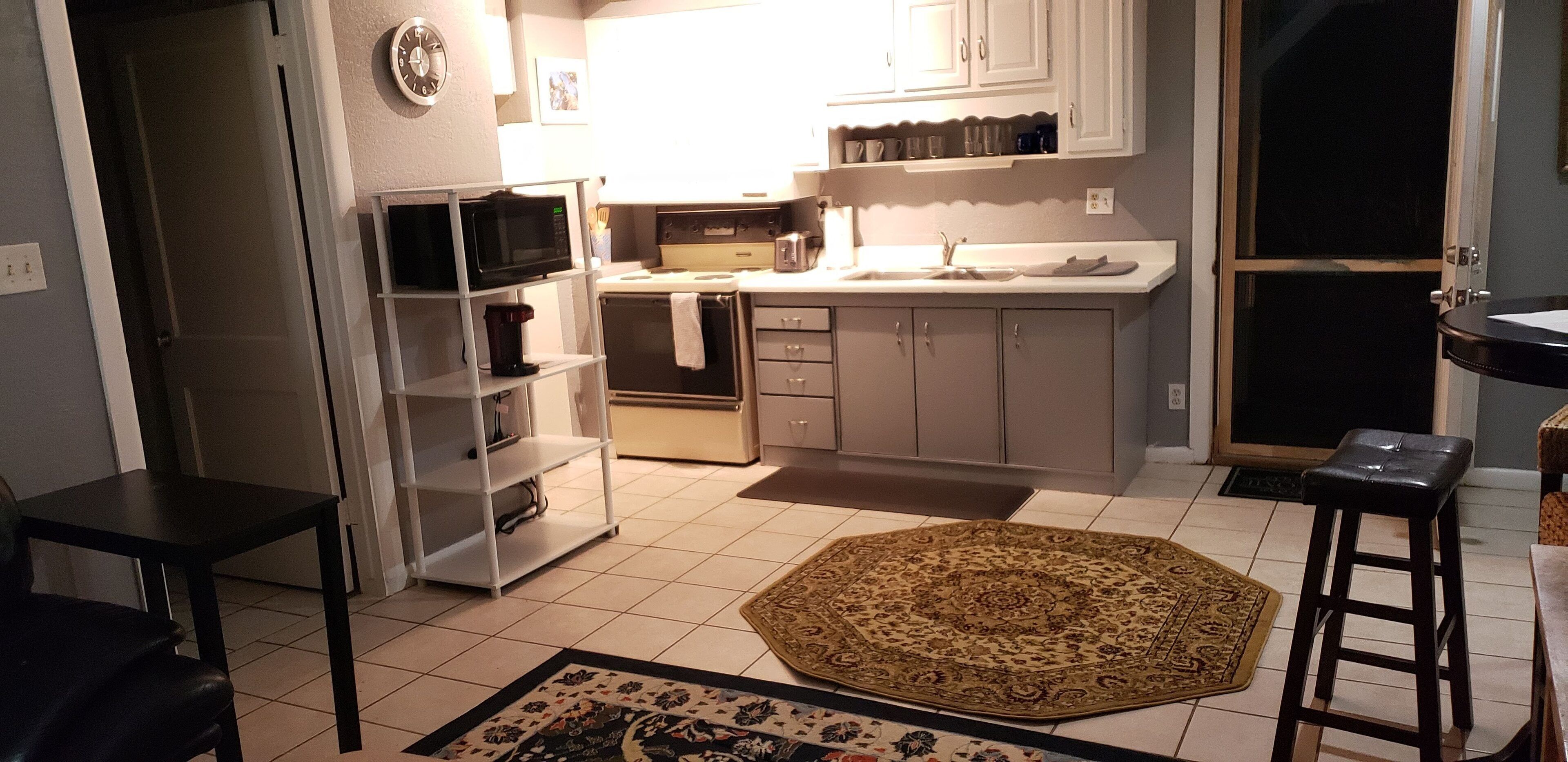 KITCHEN: Cooking basics, refrigerator, microwave, stove/oven, dishware & flatware, 12-cup drip coffee maker (starter coffee & filters provided)