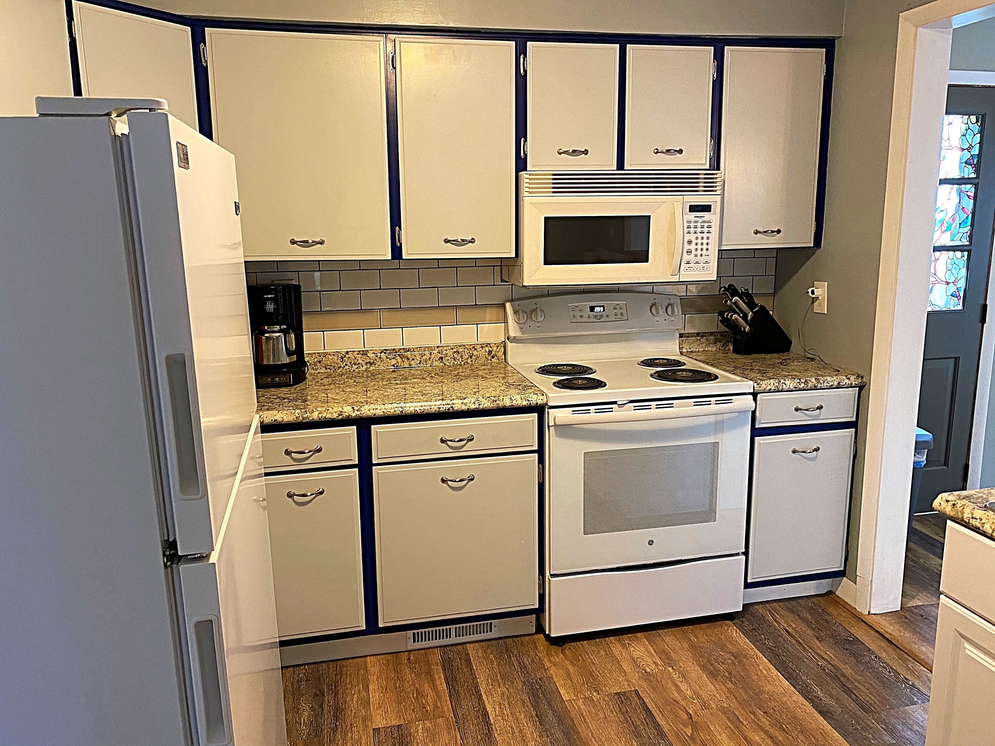 Welcome to our fully equipped kitchen, designed to make meal preparation a breeze. You'll find modern appliances, including a stove, oven, refrigerator, and microwave, along with all the cookware and utensils you might need. There's ample counter space for meal prep, and a cozy dining area nearby for enjoying your culinary creations.