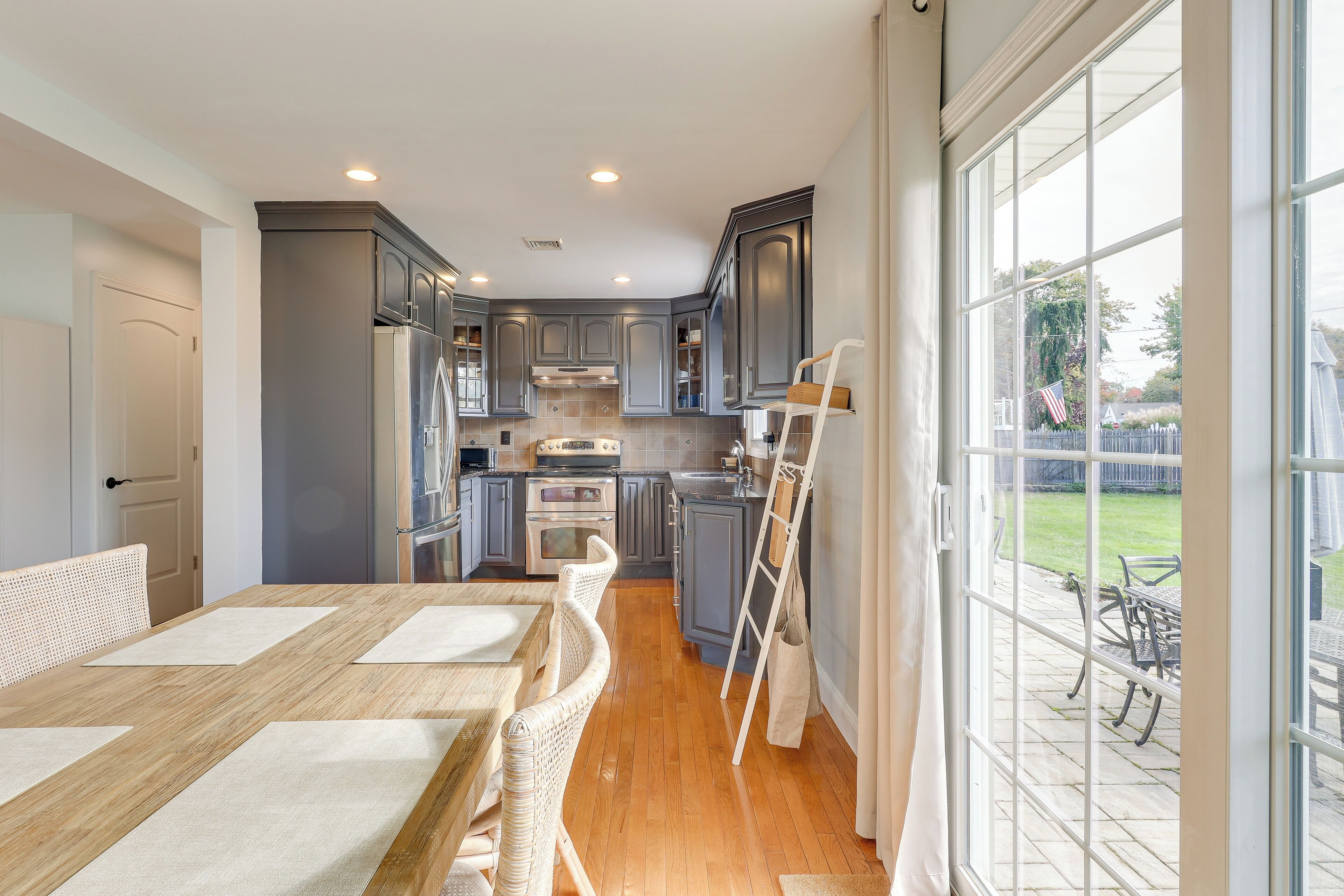 The modern kitchen is big enough for multiple guests to move in and out, and is complete with cooking essentials, including a drip and French press coffee makers. The dining room is right across from the kitchen. The fun design of this space really brings the classic New England atmosphere.