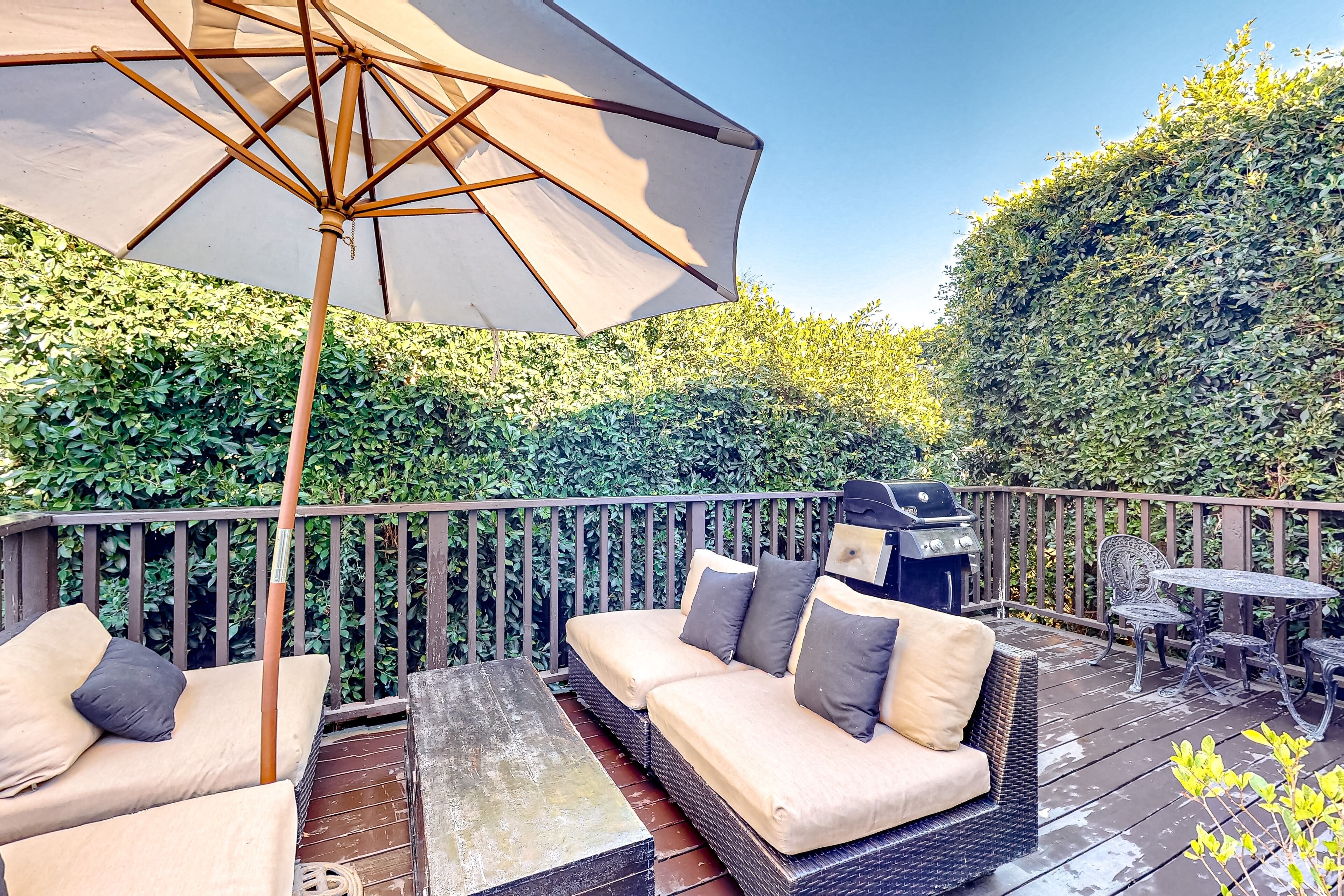 An inspiring abode, the interior of your stay is full of light, soft furnishings, and fun textures. The well-equipped kitchen is lined in marble and boasts stainless steel appliances. When you'd prefer to enjoy the sunshine and cook alfresco, utilize the gas grill available on the deck. A comfortable space to read and visit with your loved one, the private deck is lined by trees and shrouded in sunshine.