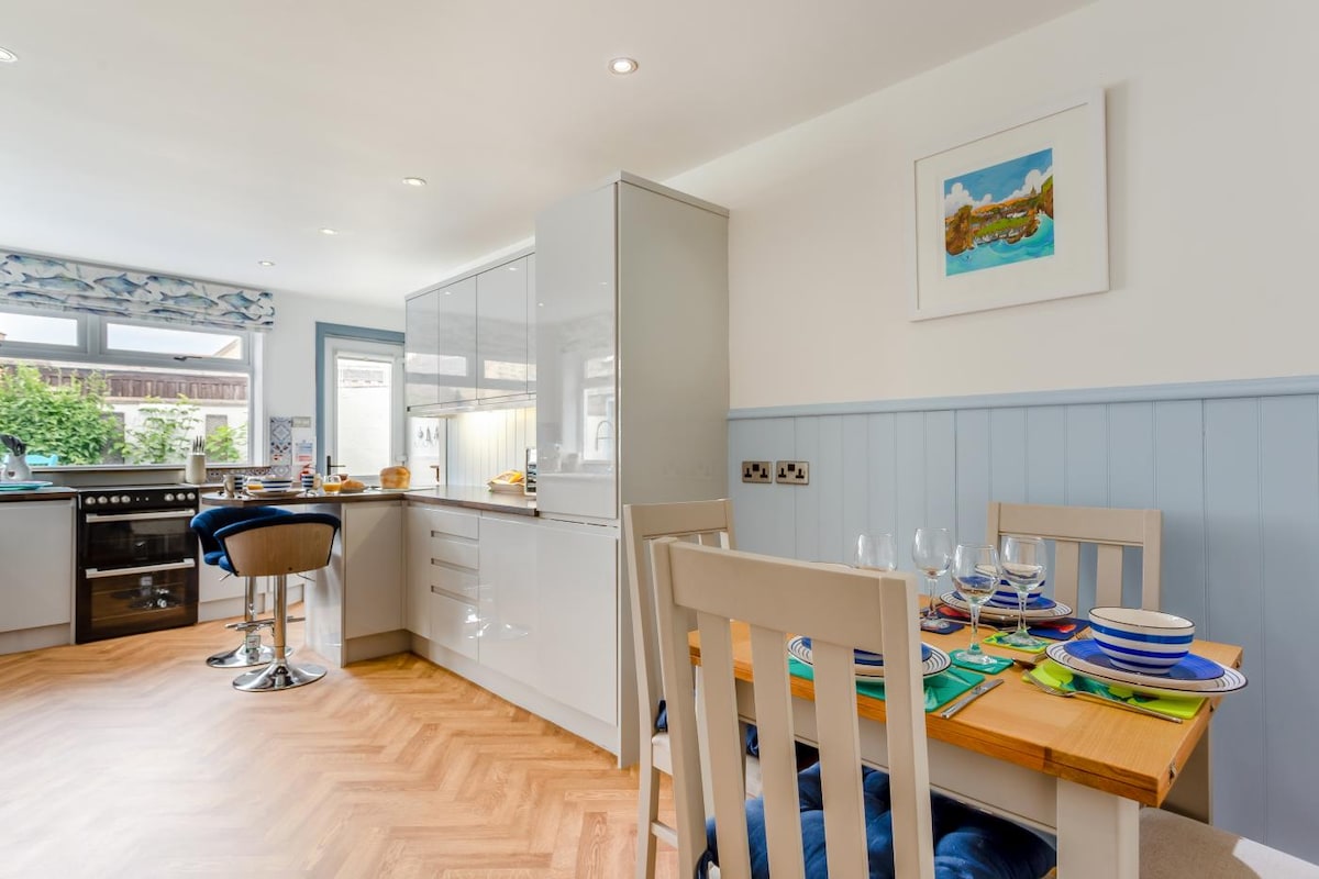 Amenities: Gas central heating with electric fire. Electric double oven and gas hob, microwave, fridge/freezer x 2, washing machine, dishwasher, TV with Freeview, DVD, CD/radio, WiFi, selection of books, games and DVDs. Table Tennis on 2nd floor. Fuel and power inc. in rent. Bed linen and towels inc. in rent. Cot and highchair on request. Ample off road parking. Front patio with furniture. One well-behaved dog welcome. Sorry, no smoking. Shop and pub 3 mins walk. Harbour and beach 5 mins walk. Note: Max 10 adults. Note: No stag/hen parties. Note: Check-in 4pm. Note: This property has a Good Housekeeping bond of £450