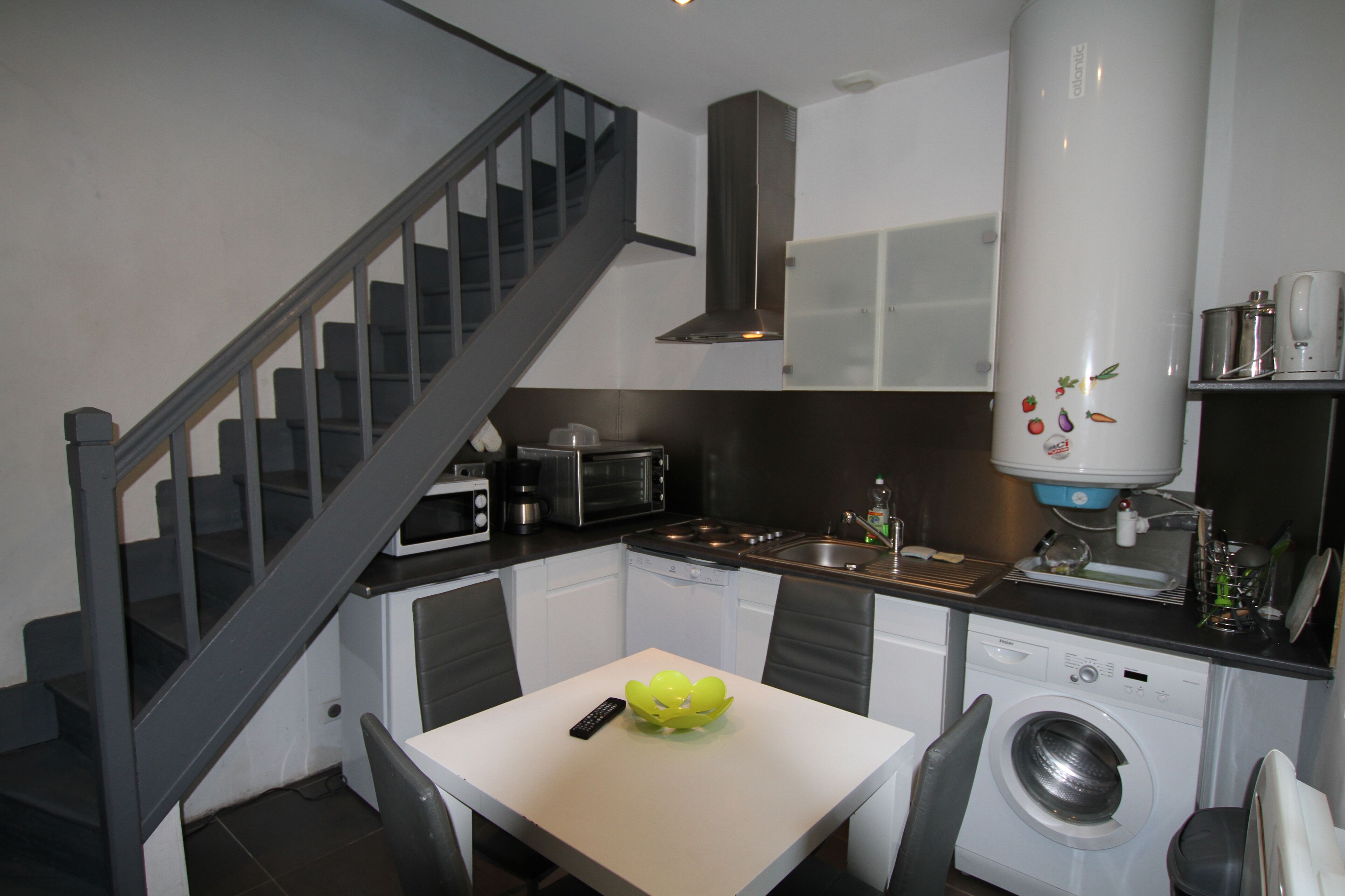 ground floor: kitchen with oven, microwave, hood, dishwasher, washing machine coffee maker, toaster, kettle, table, 4 chairs, 2 stools, dishes, household product, flat screen TV.