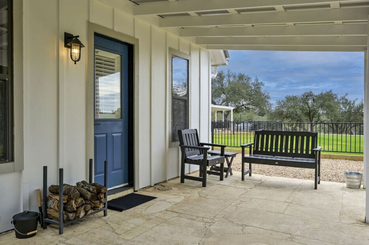 Thinking about renting Milk Bath Springs House as well? A side patio features a pergola that sits over an outdoor dining area, where you can enjoy a meal in the wonderful Hill Country weather! Covered patio areas wrap around the sides of the house for guests to sip coffee and take in this beautiful property at Milk Bath Springs!