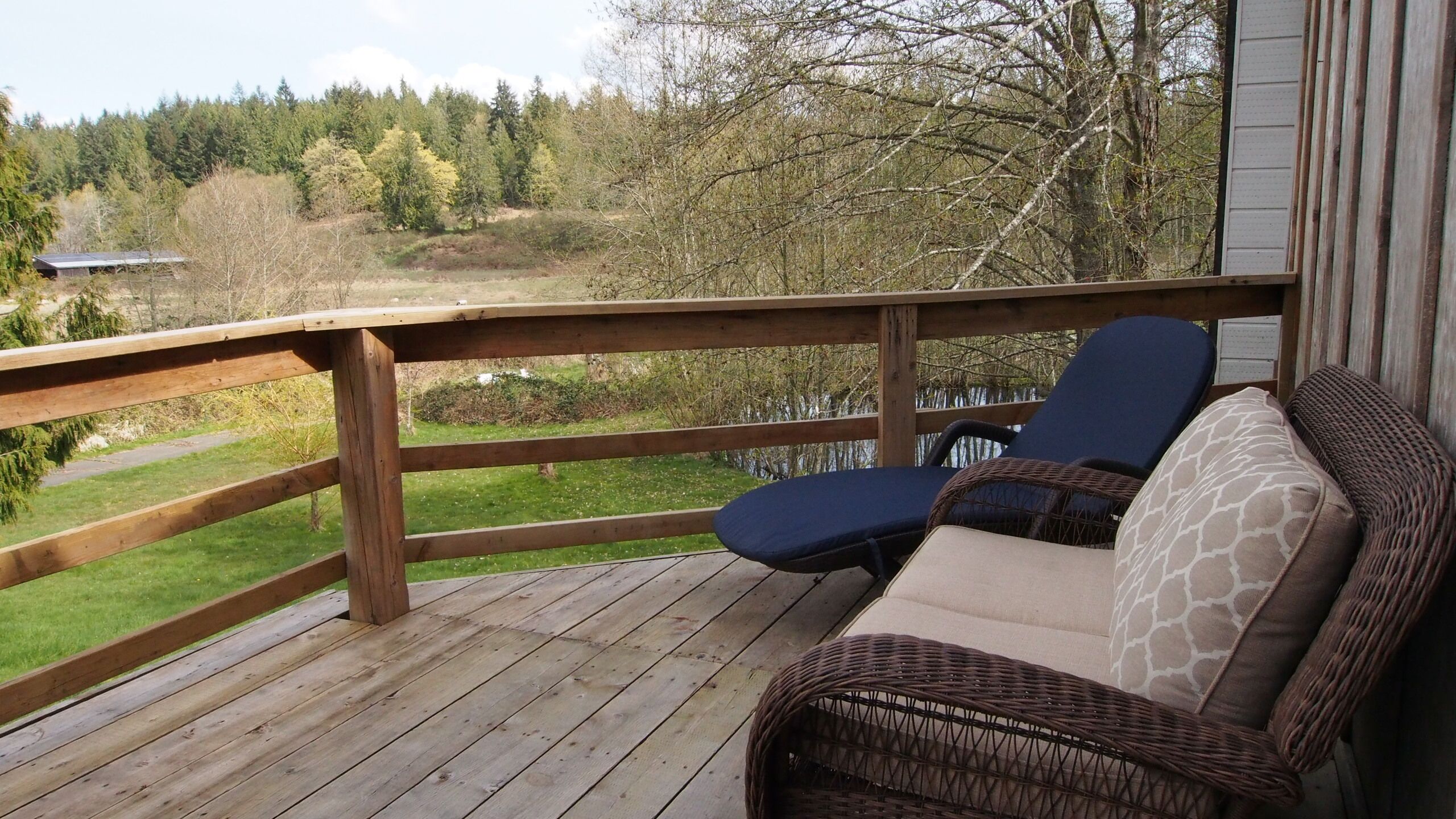 On a sunny day, slide open the glass doors to create a seamless indoor/outdoor space that steps out onto the elevated deck. Here you can sit and watch the hummingbirds eat from the feeder, enjoy a BBQ lunch or just relax on the lounge and breath in the fresh Cowichan river air.