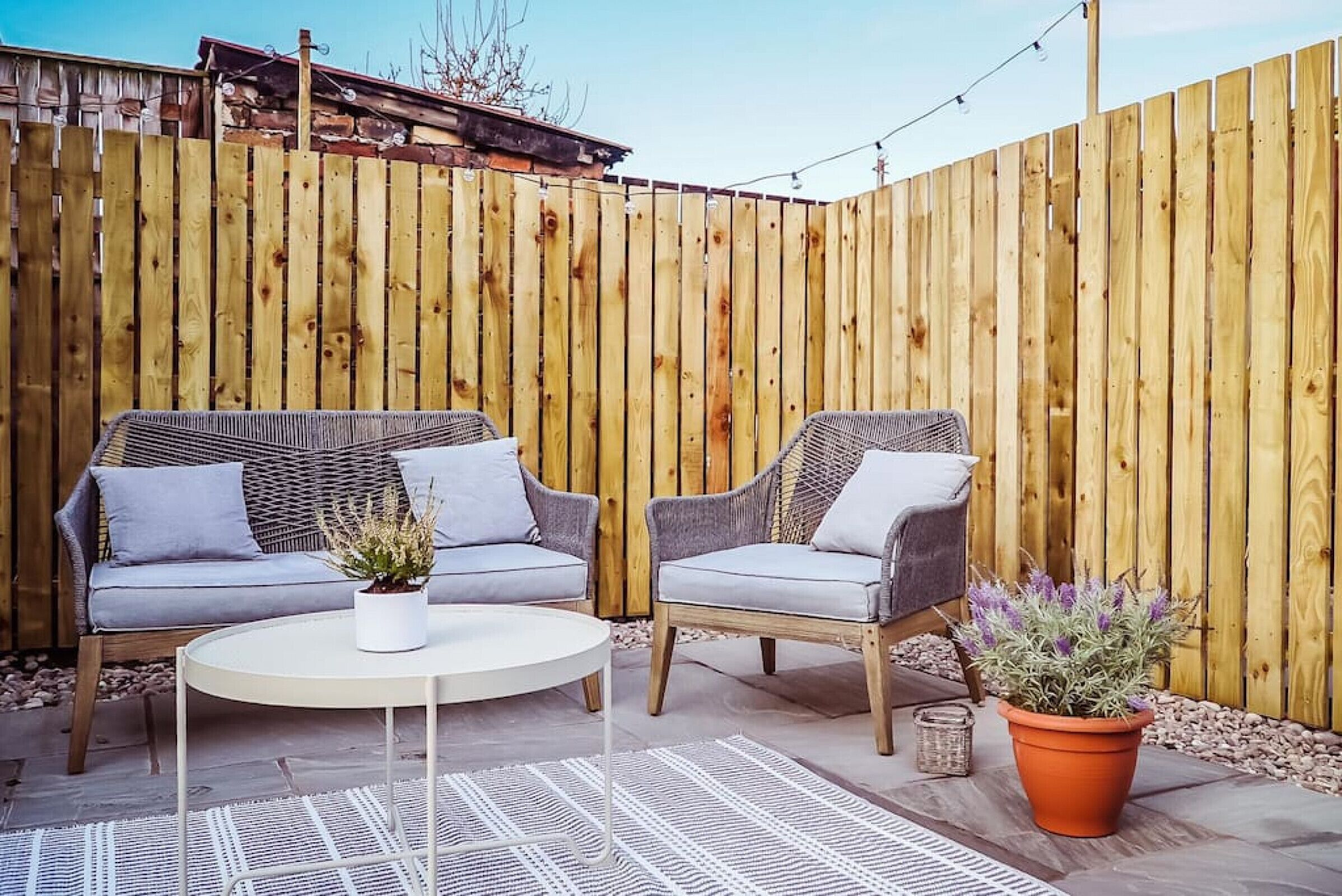 Attractive paved outdoor spaces with soft seating, outdoor lighting and BBQ.