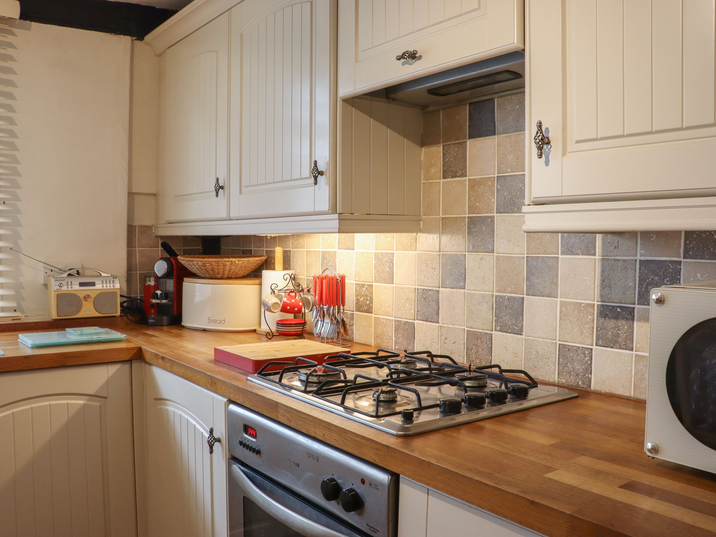 Fully furnished kitchen with cooker, fridge/freezer, washer/dryer, (no dishwasher) microwave, slow cooker and Nespresso coffee machine (Supply your own pods, I have left a few). 1 coffee cafeteria. There is ample salt pepper olive oil vinigars stock cubes & herbs. Individual marmalade’s and strawberry jam. Some tea’s coffee’s & sugar, some treats an a home made cake. I hold 5 star food hygiene rating. Foil and cling film are provided.