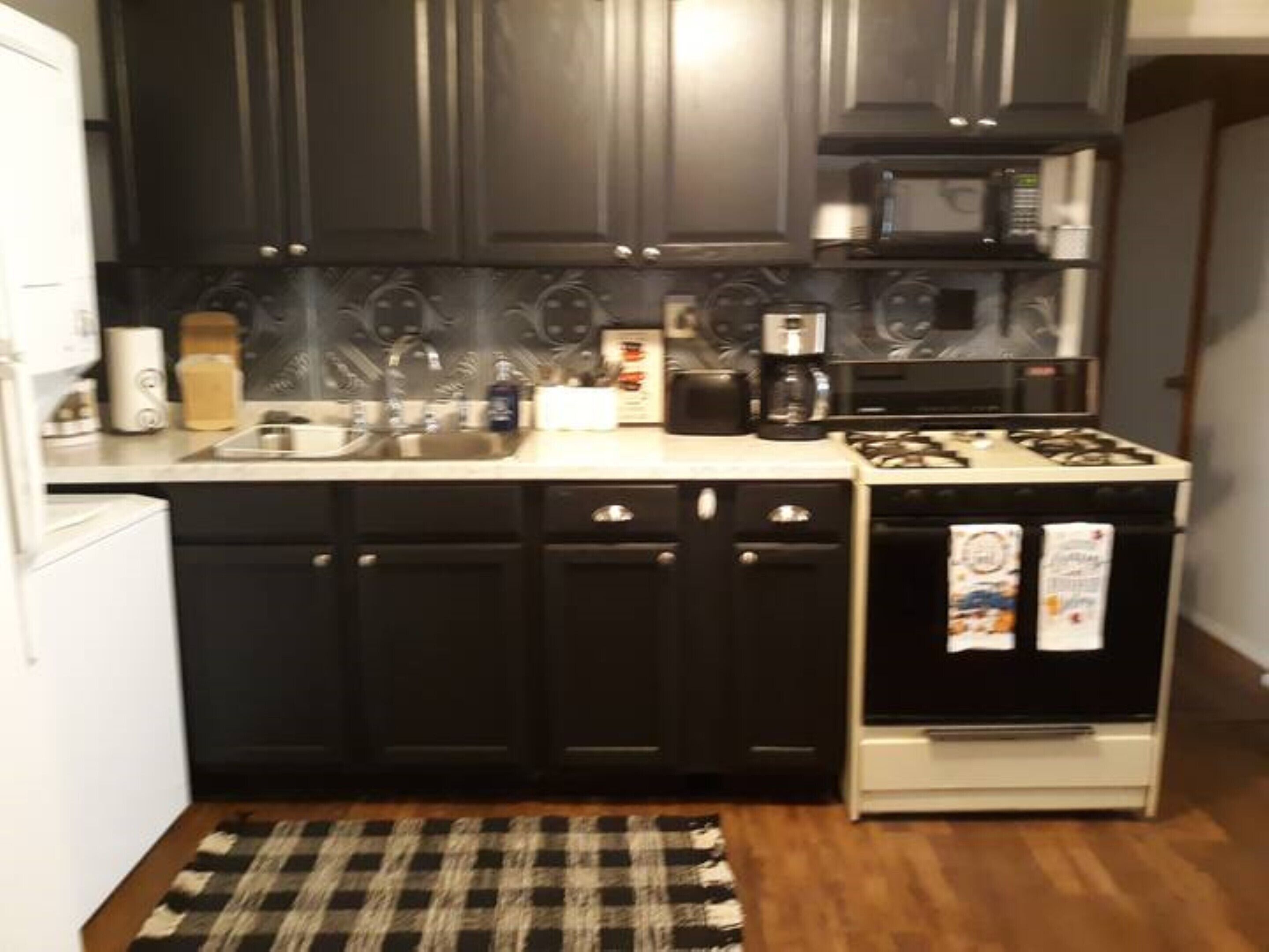 KITCHEN: Stove/oven, microwave, refrigerator, coffee maker, toaster, cooking basics, dishware/flatware, dishwasher, ice maker, trash bags/paper towels, spices