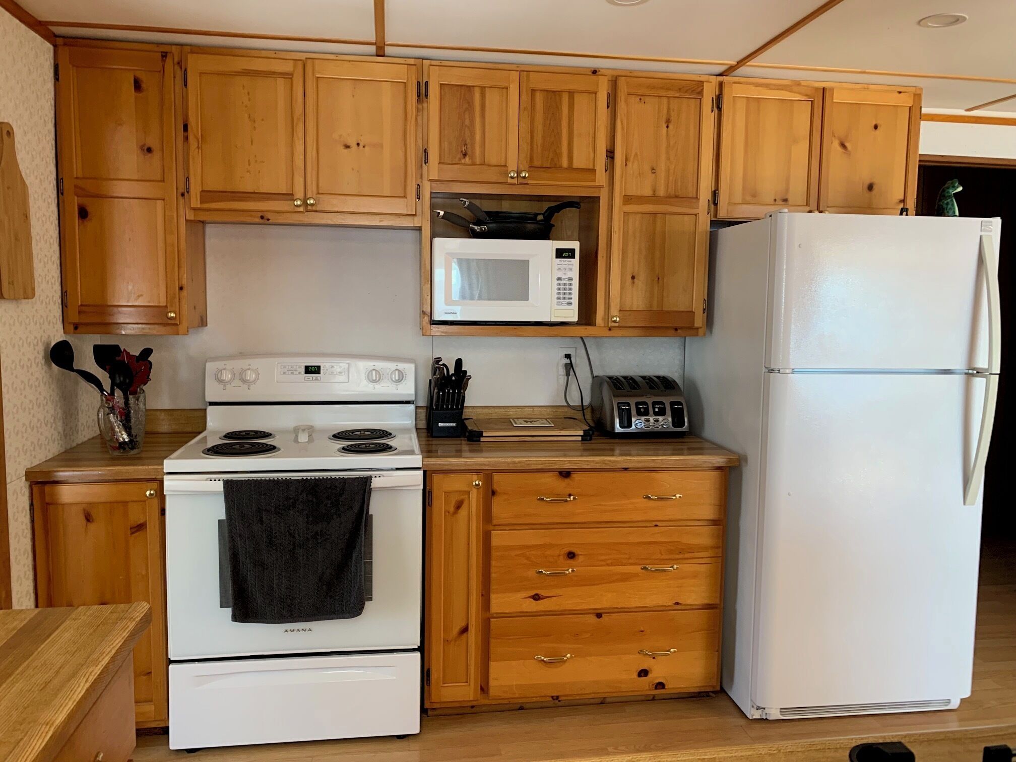 The open concept kitchen has everything that you need including a full fridge/freezer, gas stove, microwave and wine cooler to keep your beverages cold while your family is enjoying the day in the outdoors. All cutlery, utensils, cook ware, dishes, coffee makers, pots pans and basic amenities are included in this rental. The only thing that you need to bring will be your clothes and food!