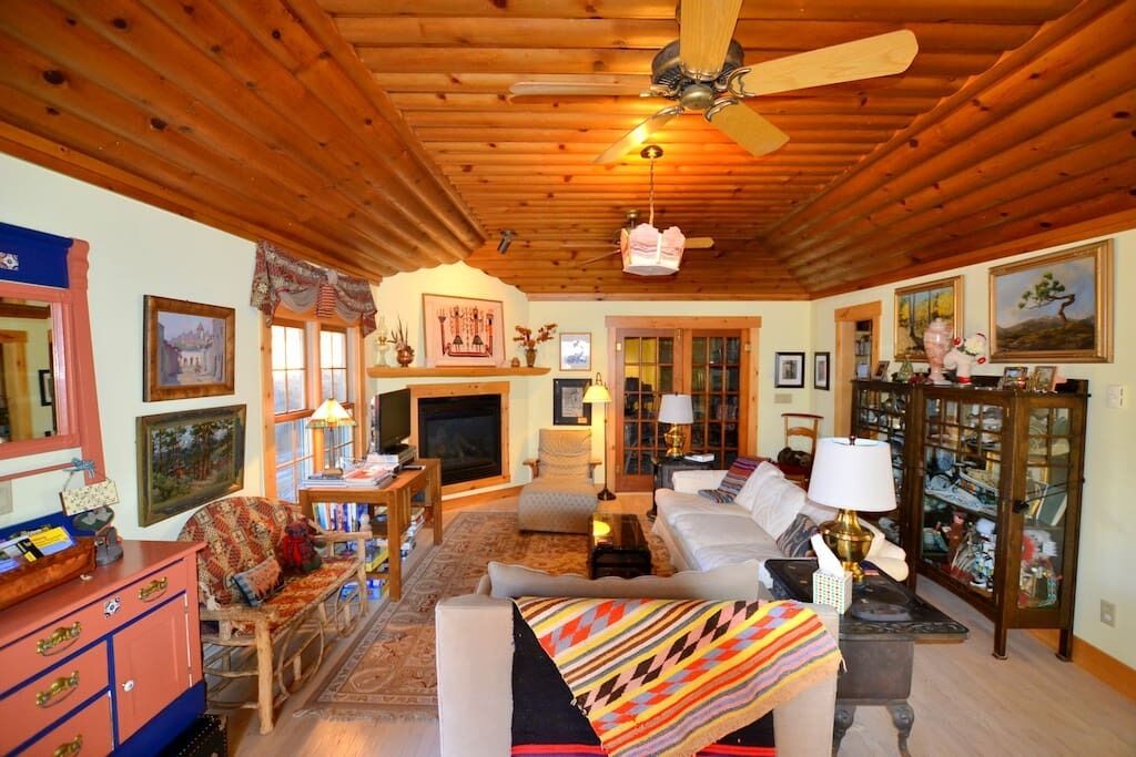 Cable TV in 3 rooms . Master bedroom contains two queen sized log beds. Large upstairs loft/bedroom contains two queen sized log beds. We do not allow more than 4 guests as the water supply is from a well and can serve this size group.