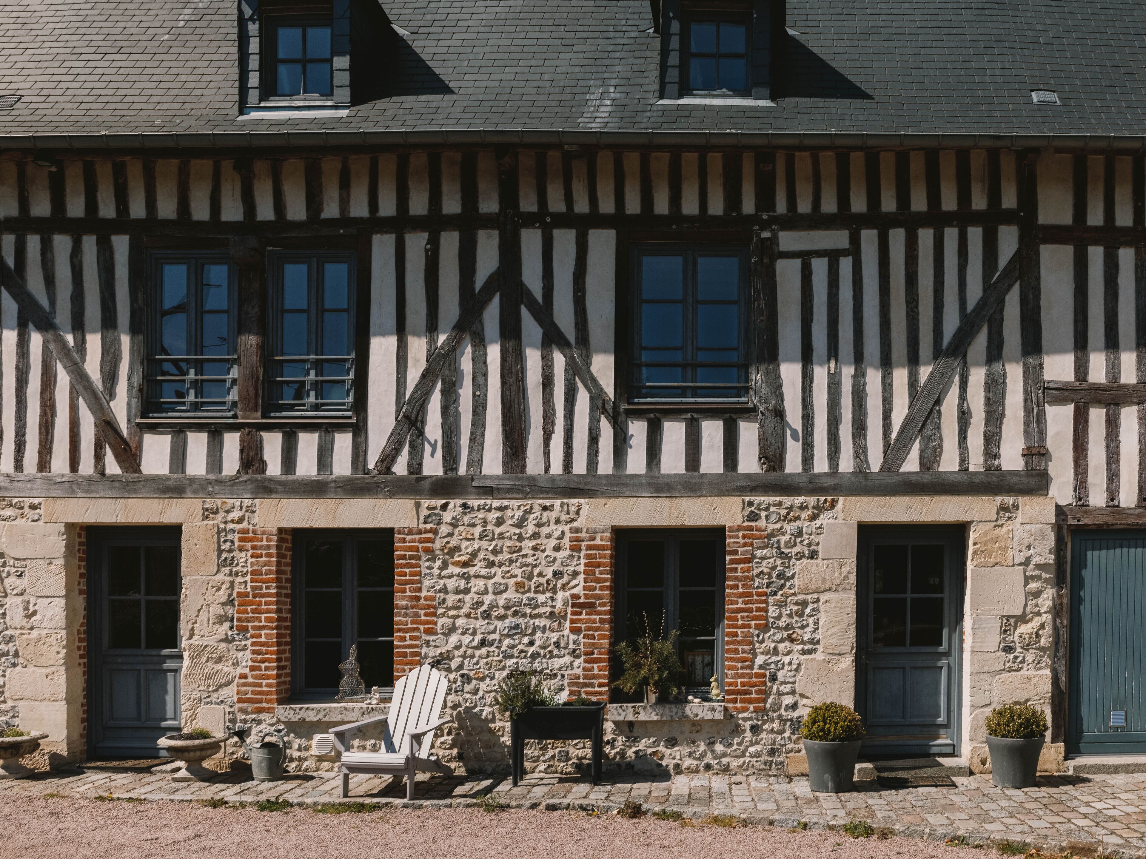 The house has been rebuilt by local craftsmen in 2012 and most of its original features have been kept. The presence of bricks and stone and the timber frame is characteristic of regional houses in Normandy. It used to be a rural building and we wanted to keep the main features. We added to it a large glass veranda that allows you to enjoy the garden and the view in any weather.